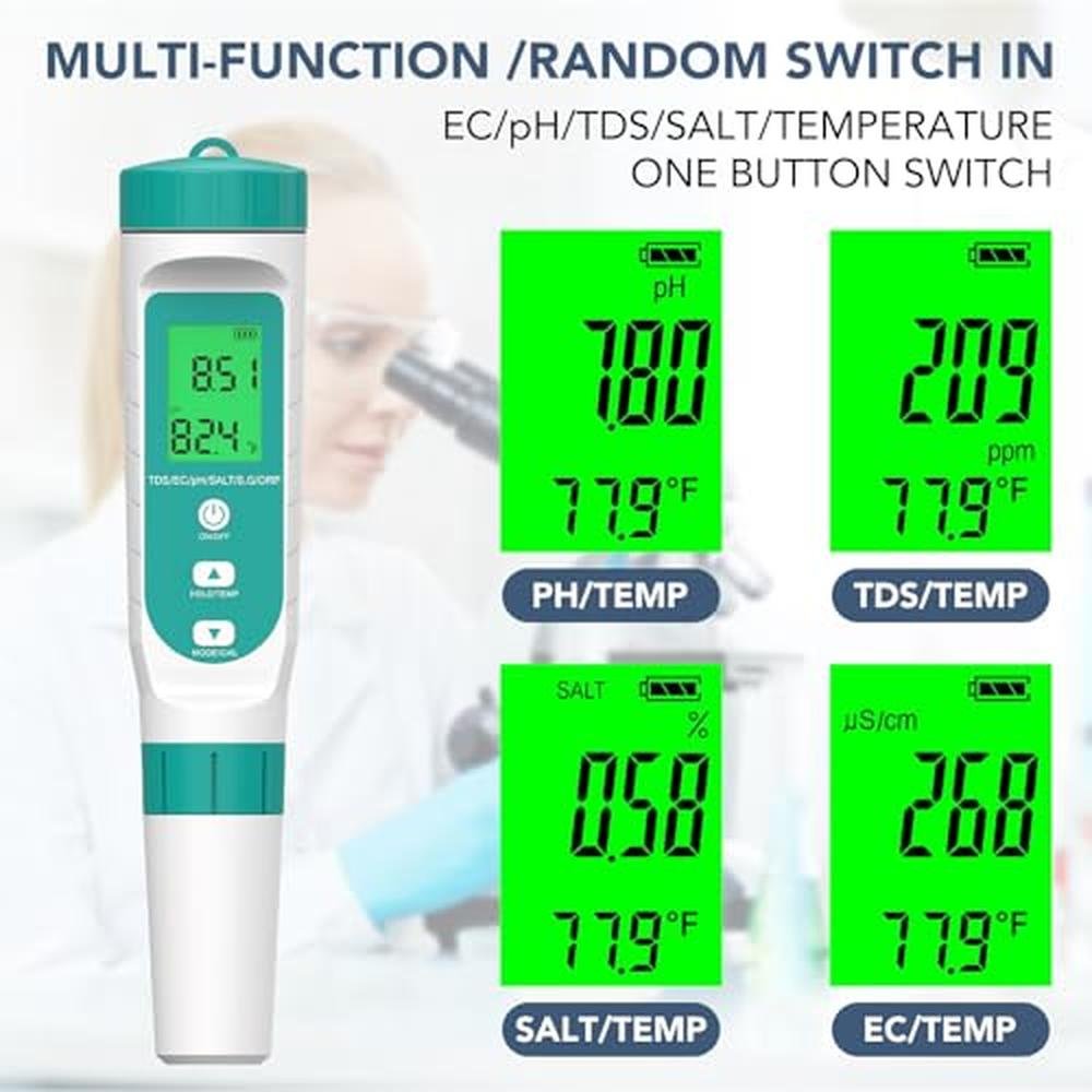 - All-in-One Water Tester for Home Use: This 7-in-1 device acts as your digital pH tester, TDS meter, EC checker, ORP monitor, temperature gauge, salinity tester, and S.G meter. Get a complete water quality check in seconds.