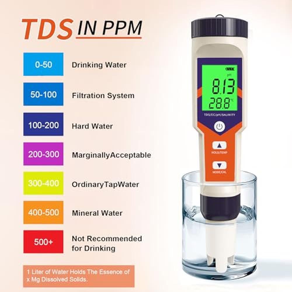 GISNPA Digital PH Water Tester, 5 in 1 PH/TDS/EC/Salt/Temp Meter, a Practical Portable Meter for Pool, Aquarium, Drinking Water, Shower& Kitchen Drinking Water for The Household