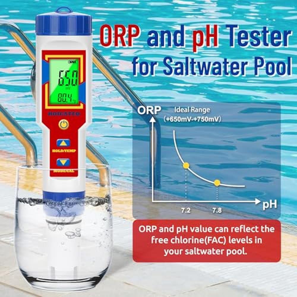 - pH ORP Tester for Chlorine Pool: ORP value shows how well your chlorines working in your pool. For chlorine pool, there is an inverse relationship between pH and ORP. The higher the pH of the pool, the less active free chlorine will be. Therefore, it is important to keep the pH between 7.2 and 7.8 to ensure optimum chlorine efficiency. In healthy saltwater pool, ORP should read between 650 mV and 750 mV.