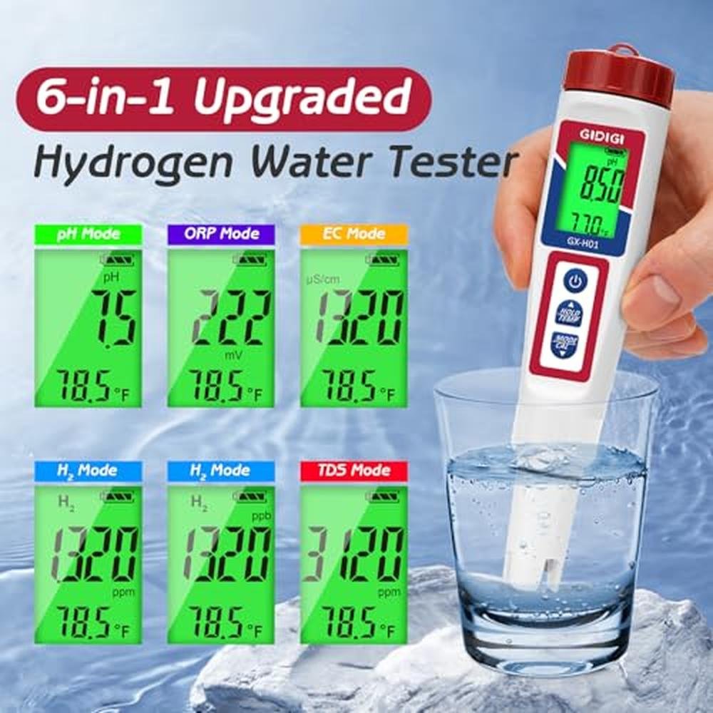 - 6-in-1 Multi-Function Water Tester:Accurately measure pH, TDS (Total Dissolved Solids), EC (Electrical Conductivity), ORP (Oxidation-Reduction Potential), hydrogen concentration (H2), and temperature in one compact device. Perfect for testing drinking water, hydroponic solutions, hydrogen water bottles, kombucha, pools, aquariums, and more
