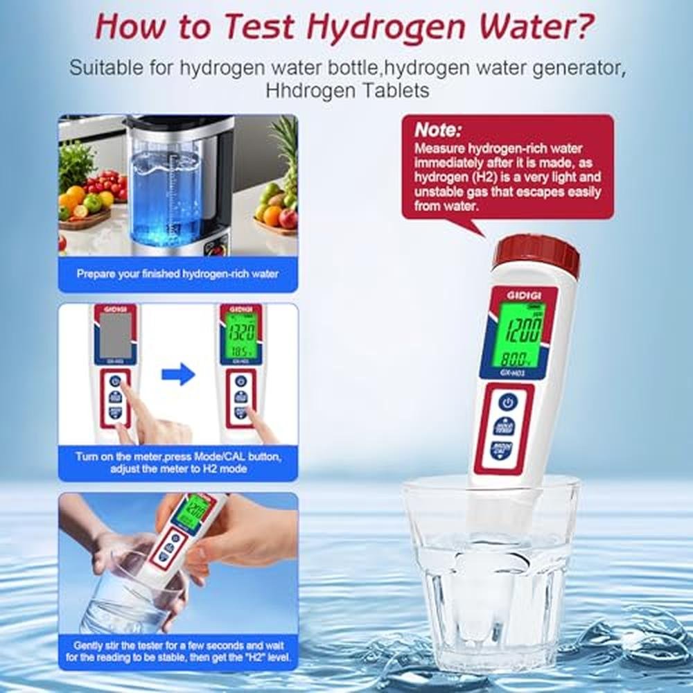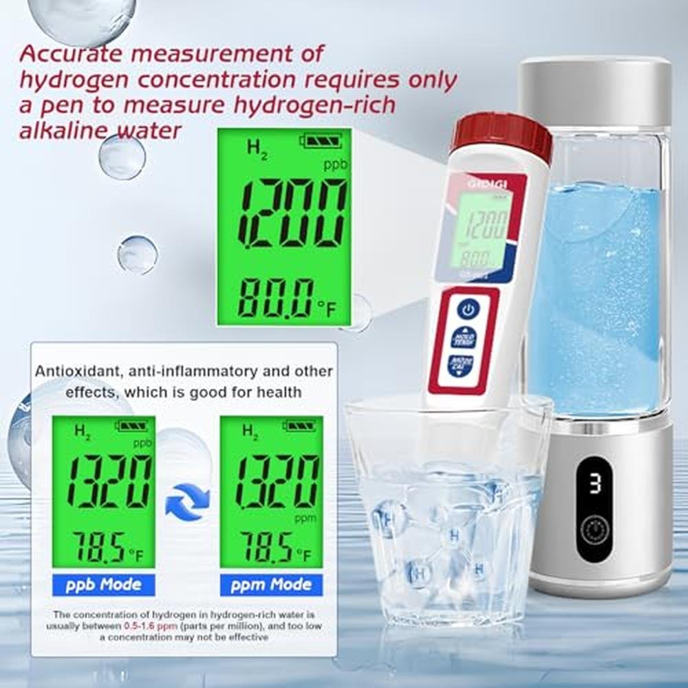 - High-Accuracy Hydrogen Water Tester:Specifically designed to measure hydrogen levels in water treated with hydrogen water bottles or generators. With a range of 0-2400ppb/0.001-2.400ppm, this tester provides precise hydrogen concentration readings, ensuring your water is optimized for health benefits