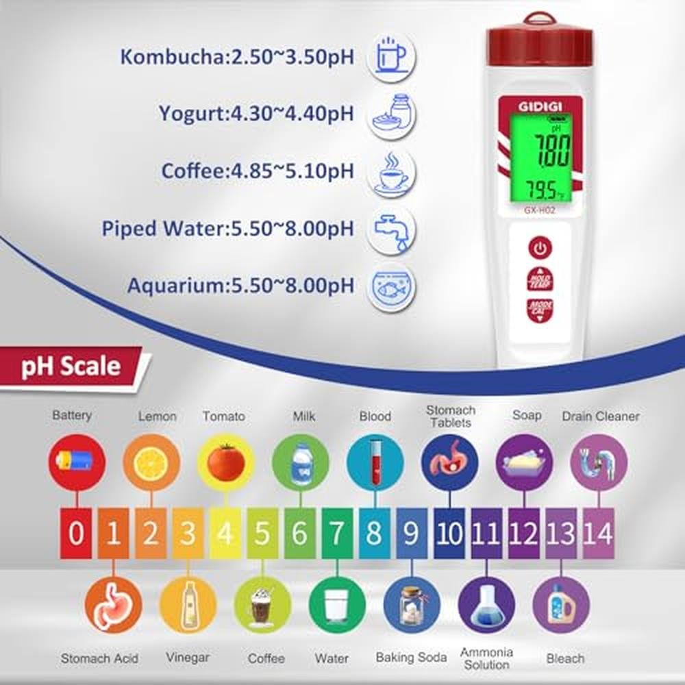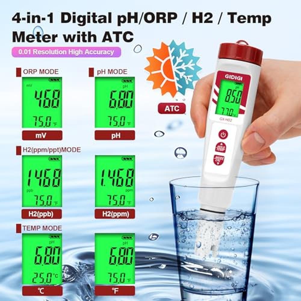 - Digital pH/ORP meter for Hydrogen Water: You can Hydrogen testing regularly (such as daily or weekly). pH test range is 0.00~14.00, accuracy: 0.01pH; ORP test range:-990~+990mV, accuracy: 2mV. GIDIGI digital pH meter allows you to test the pH and ORP values of your water at the same time. The ideal pH of hydrogen water is 7.2-8.0 and ORP is -150--850mV. The pH and ORP tester can meet all hydrogen water testing needs.