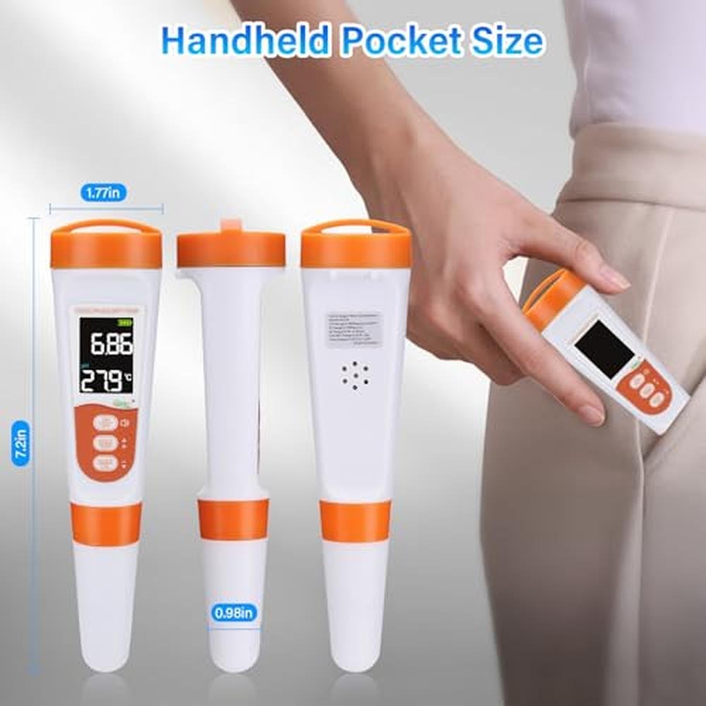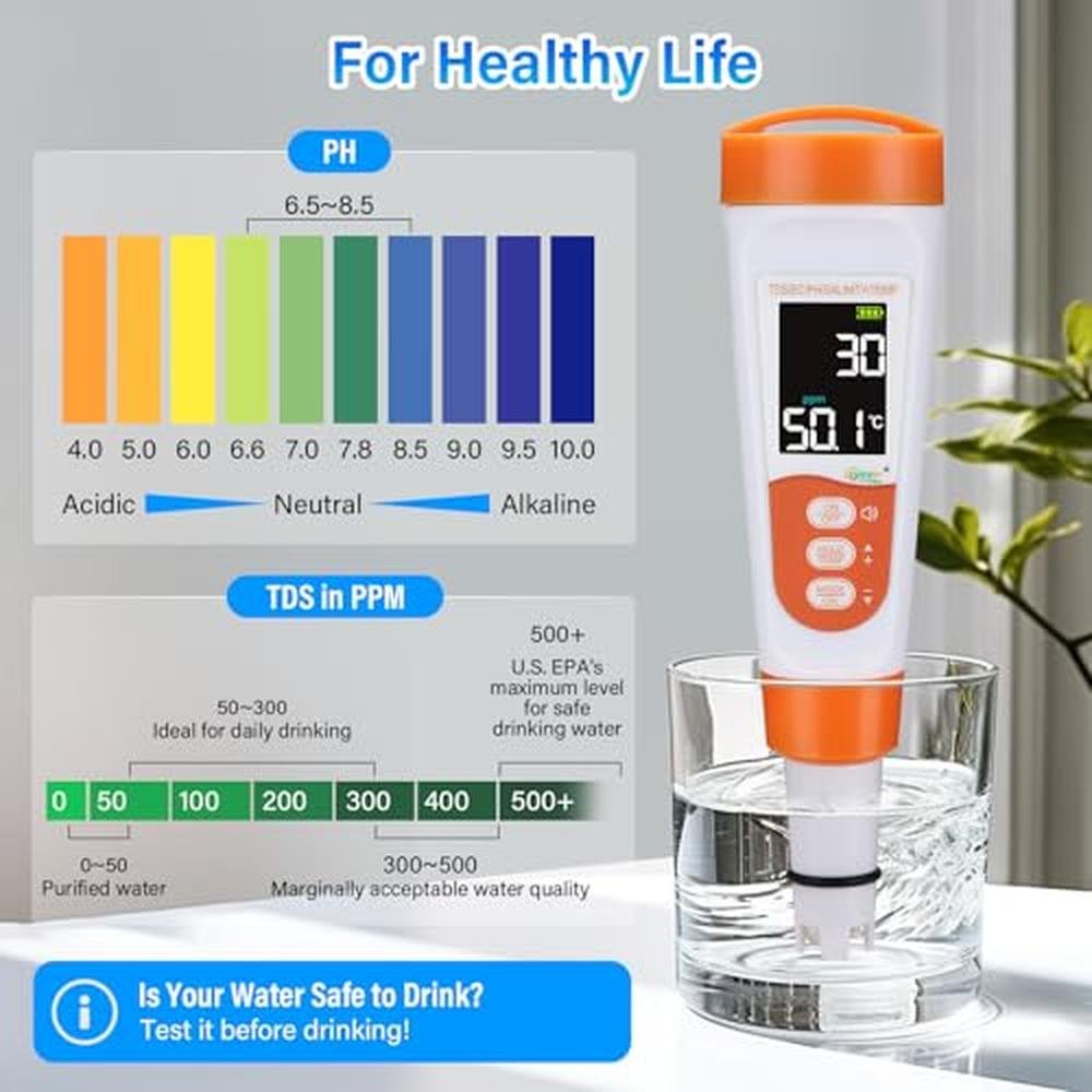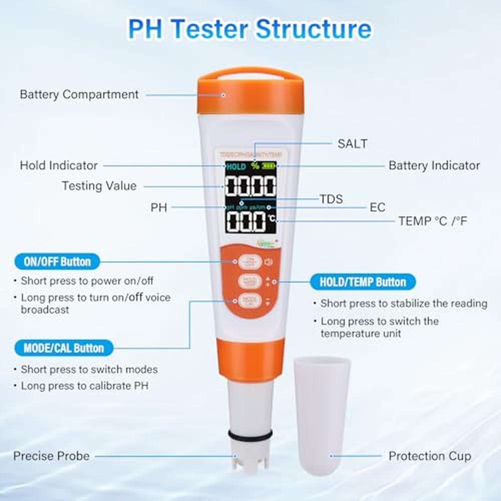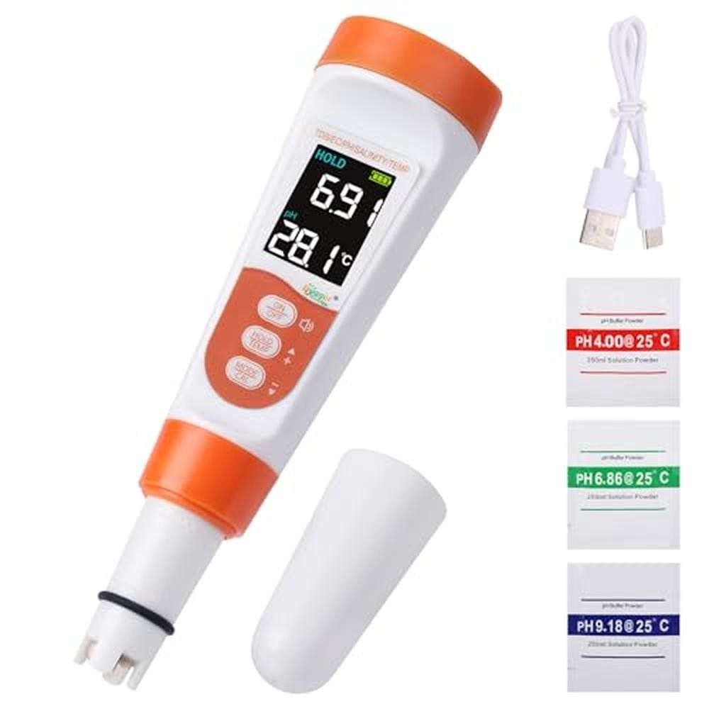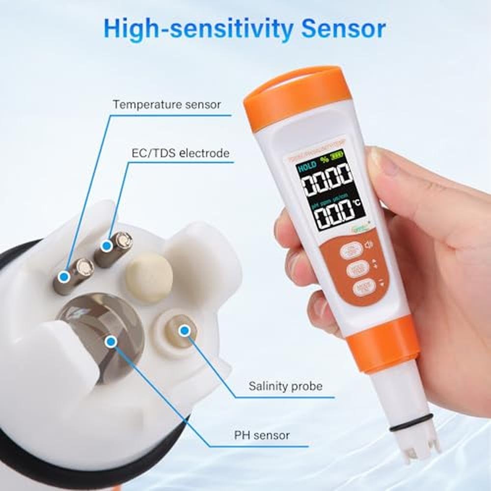 • 5-in-1 TDS Meter: Equipped with 4 high-sensitivity probes, which can measure PH, TDS, EC, SALT, and TEMP. with high precision at the same time. Measurement Range: PH: 0-14.00pH, Accuracy 0.05pH; TDS: 0-9999ppm, Accuracy 2%; EC: 0-9999s/cm, Accuracy 2%; SALT: 0-9999pm; Temp: 0.1-60/32.1-140; All-round measurement of water quality to ensure healthy water quality