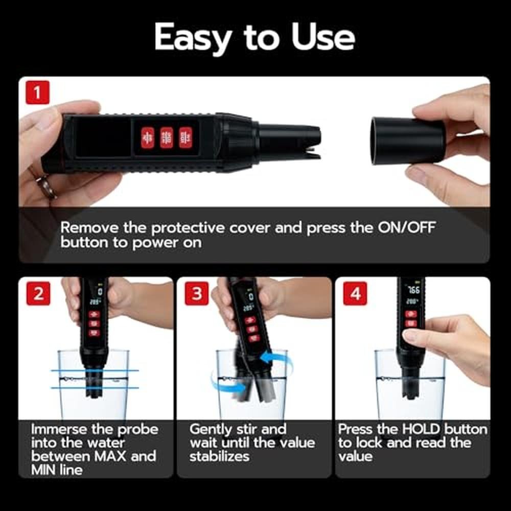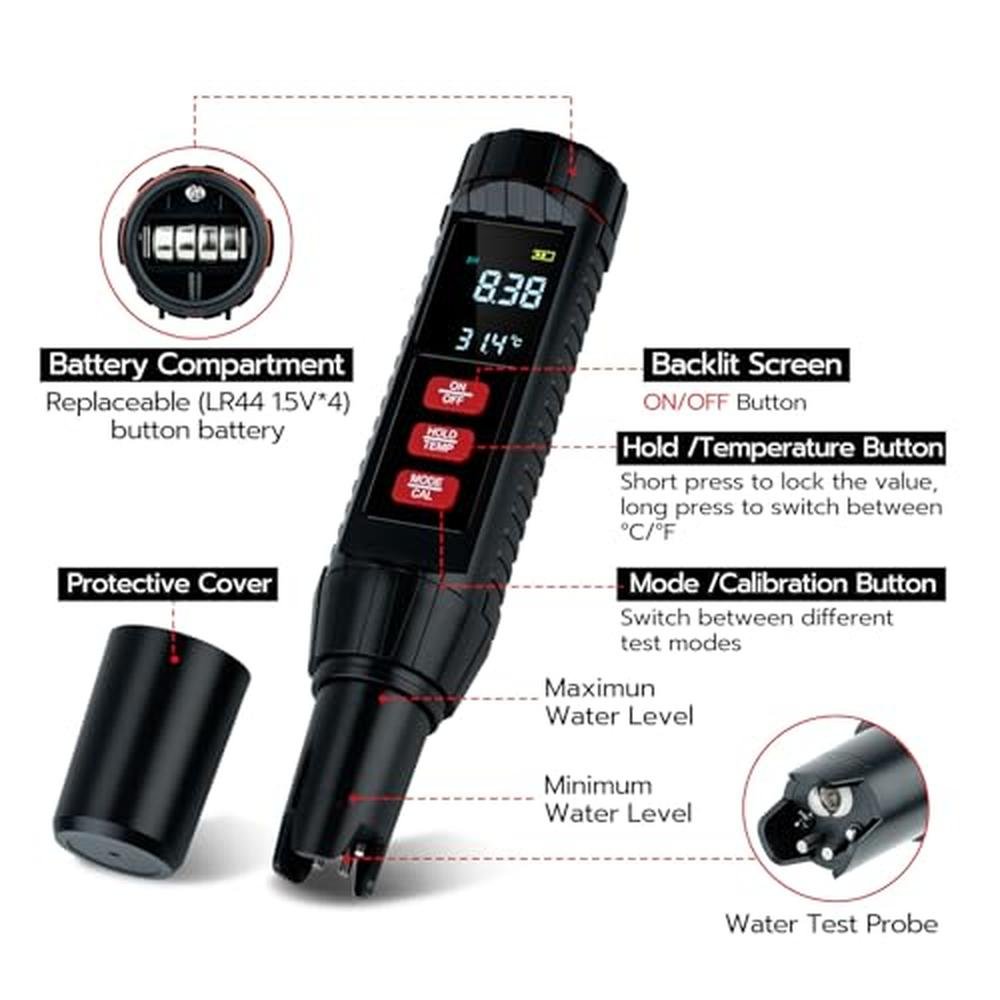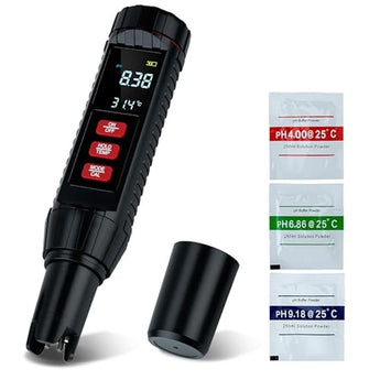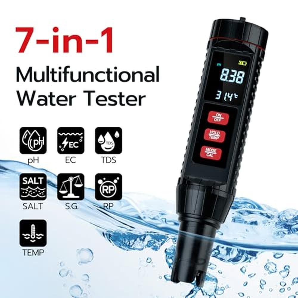 Product Description:Take control of your water quality with the ultimate all-in-one solution! Our advanced 7-in-1 Water Quality Tester combines professional-grade accuracy for pH, Salinity, TDS, EC, ORP, Temperature, and Specific Gravity into a single, rugged, and easy-to-use handheld device.Whether you're a pool owner, aquarist, hydroponics enthusiast, farmer, lab technician, or concerned about your drinking water, this tester delivers the critical data you need. The innovative design features a super-clear VA screen readable even in low light, automatic temperature compensation for dependable results in varying conditions, and a handy one-button HOLD function to lock measurements for recording.Built for real-world use, it boasts an IP67 waterproof rating confidently use it in rain, near splashes, or in humid environments. Its compact, lightweight design fits easily in your pocket for on-the-go testing anywhere. Powered by long-lasting, user-replaceable LR44 batteries (included and shown on-screen), it intelligently conserves power with auto-shutoff.Start testing right away with the included calibration powders! Get precise pH readings every time with the provided pH 4.00, 6.86, and 9.18 buffer solutions. Experience the convenience and reliability of professional water testing in the palm of your hand.Important Usage Notes:For Best Results & Longevity: Always rinse the electrode thoroughly with distilled water immediately after testing.Ensure Accuracy: Before taking a reading, confirm the probe is fully submerged within the marked MIN and MAX levels on the device. Readings taken outside this range may be inaccurate.Remember to press the ON/OFF button to power down the tester after use.Package Includes:1 x Multi-Parameter Water Quality Tester (Black)1 x QR Code Card1 x pH 4.00 Calibration Buffer Powder1 x pH 6.86 Calibration Buffer Powder1 x pH 9.18 Calibration Buffer Powder