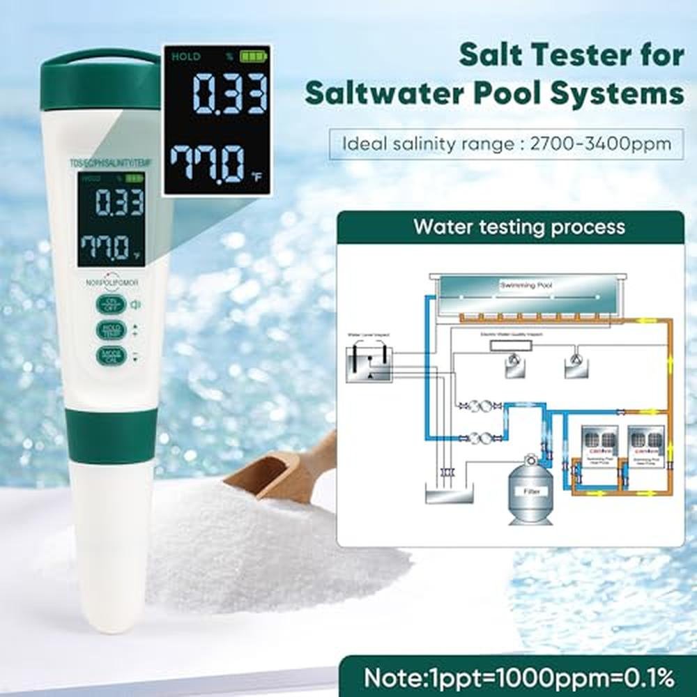 - [Multifunction Audio Water Quality Meter]5 in 1 water tester incorporates pH,TDS,EC,Salinity and temperature functions which enables us detect several groups of reading on the targeted liquid.
