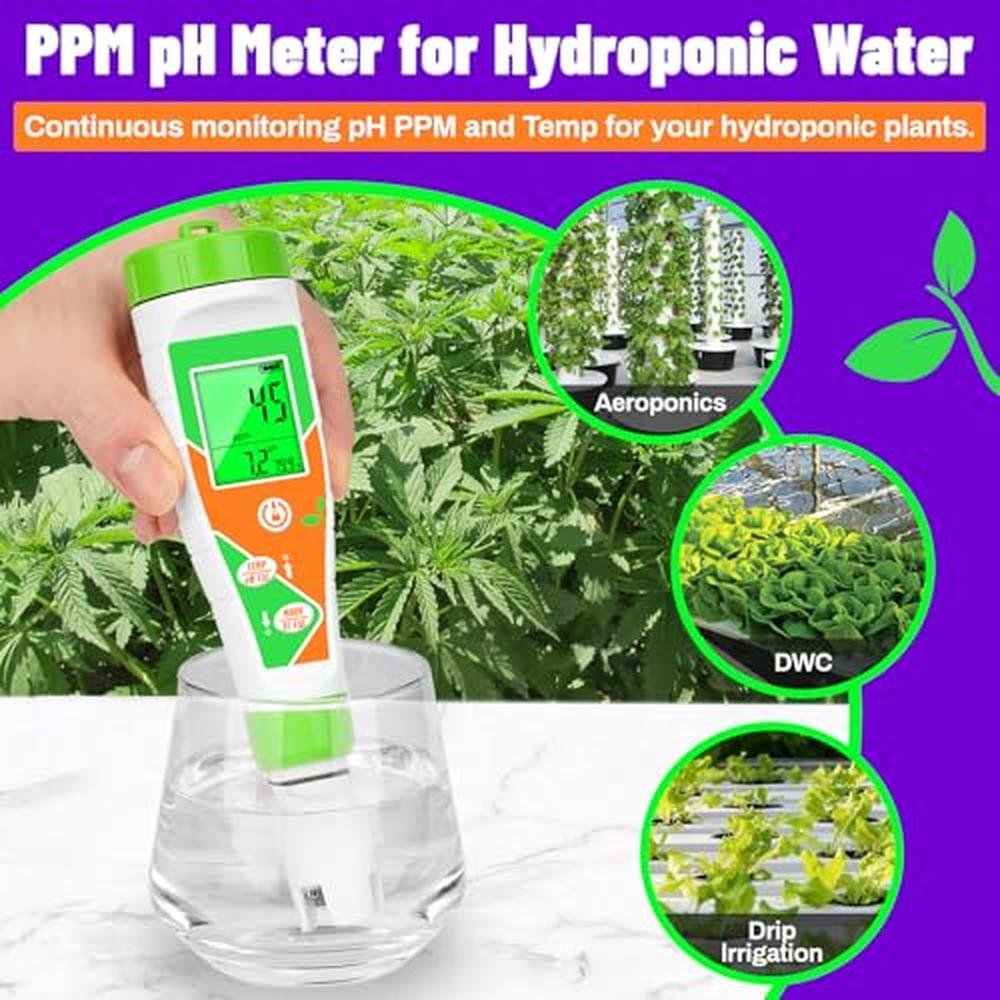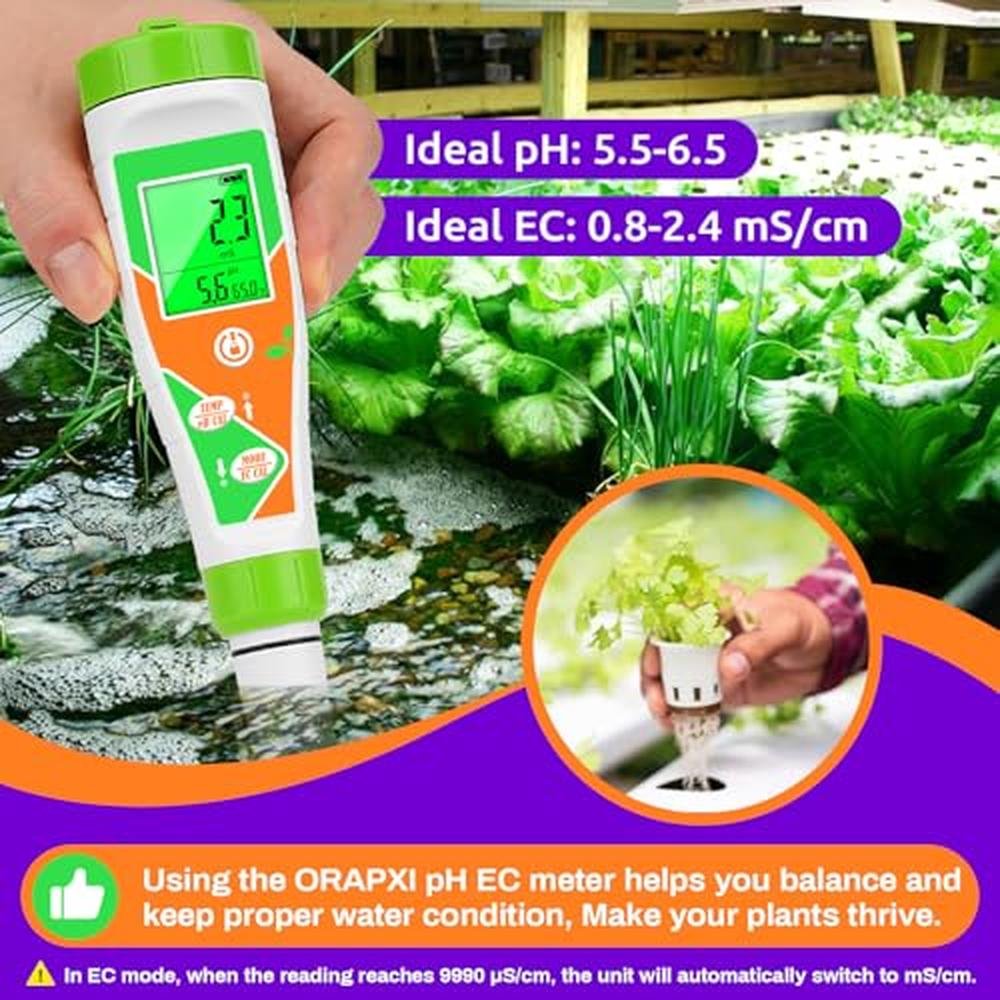 - [pH EC Tester for Hydroponics] In hydroponic systems, the pH and EC levels of the nutrient solution play a critical role in plant growth. ORAPXI pH PPM meter closely monitors pH and EC values while growing the plant. Our pH PPM meter is easy to use for both beginners and experienced growers and is an essential tool for maintaining optimal pH and EC levels.