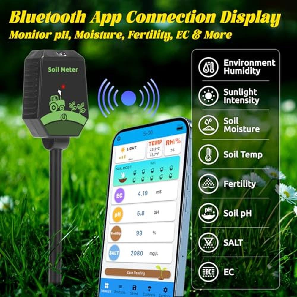 • All-in-One Soil Testing Kit: ORAPXI 8-in-1 Bluetooth Soil Tester replaces the need for multiple separate devices. Measure soil pH, EC, moisture, fertility, salinity, sunlight intensity, air humidity, and temperatureall in one tool. Save time, money, and hassle by getting complete soil diagnostics with a single purchase.