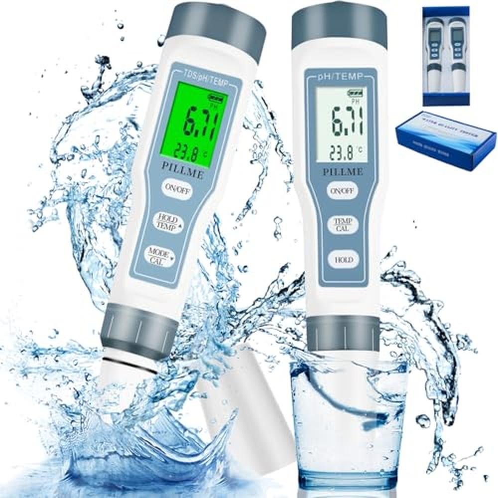 • 2Pack 3-in-1 Water Quailty Testers, Flexible backup PILLME water quality tester adopts innovative combination to combine two different testers into one set, which can compare data during measurement to ensure accuracy, and one tester can be flexibly backup.3-in-1 design allows for high-precision simultaneous measurement of pH, TDS, and temperature. Measure water quality comprehensively to ensure healthy water quality