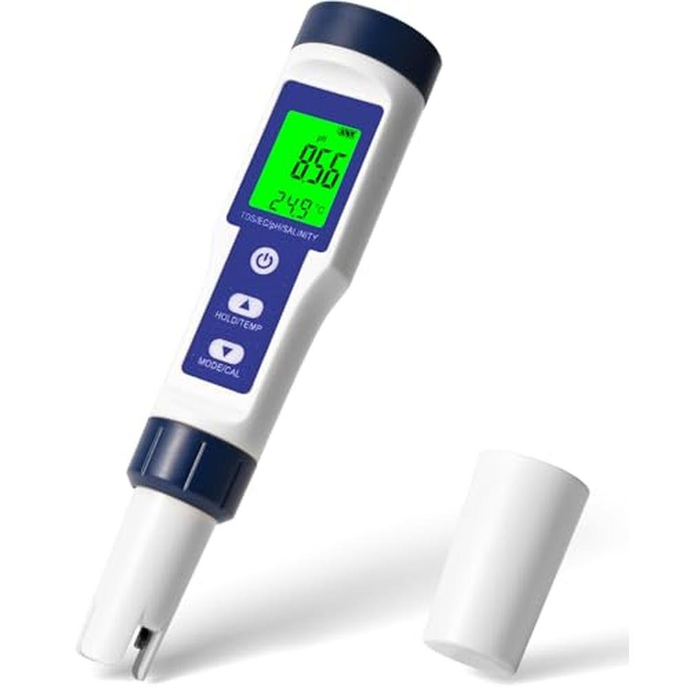 5-in-1 Pool Salt Tester-Smarter Water Testing Starts HereMaintaining water quality is not easy. With the 5-in-1 digital pool water tester, you gain real-time, lab-grade accuracy for five essential water quality parameters: salinity, pH, TDS, electrical conductivity (EC), and temperature. Whether it's a backyard pool, a spa, or a delicate aquarium, this compact electronic pool water tester helps you manage water balance effortlesslyno strips, no guesswork.Perfect Pool Salt Balance & Skin-Friendly PHMaintaining saltwater pools requires precision. This saltwater pool test kit helps you stay within the ideal salinity range of 27003400ppm and pH range of 7.27.8. These levels ensure chlorine efficiency and provide a gentle swimming experience, leaving your skin soft and your eyes irritation-free after every swim.Reliable Aquarium Salinity and pH ManagementHealthy aquatic life starts with stable water. Our aquarium pH and salinity tester supports both freshwater and saltwater environments. Accurately monitor ionic balance and prevent harmful water fluctuations to create an optimal habitat for your fish. Ideal for fish tanks, reef tanks, and aquaponics setups.Optimize Hydroponics and Plant NutritionHydroponic systems thrive on precise pH and EC levels. The salt water tester doubles as a hydroponics tooldisplaying EC, pH, and temperature simultaneously. Whether using DWC, NFT, or aquaponics systems, easily test your nutrient solution to maximize plant growth and nutrient absorption.PH Testing for Home BeveragesAlso ideal for testing the pH of beverages such as kombucha, coffee, tea, wine or lemonadegreat for home brewers, chefs, and health-conscious users.Test Alkaline Water, Tap Water & RO SystemsEnjoy clean, properly balanced drinking water. Use the salt water tester to verify the pH of alkaline water, bottled water, and reverse osmosis systems. Assists in monitoring water quality for RO water systems, alkaline water, bottled water, tap water, well water, and city/municipal tap water.Advanced Probe Technology for Accurate ResultsEquipped with a high-sensitivity glass electrode and upgraded chip design, this digital salt water pool tester delivers improved accuracy and longer sensor life. The sensitive probe ensures consistent, stable readings across all liquid types, from pool water to beverages to hydroponic reservoirs.