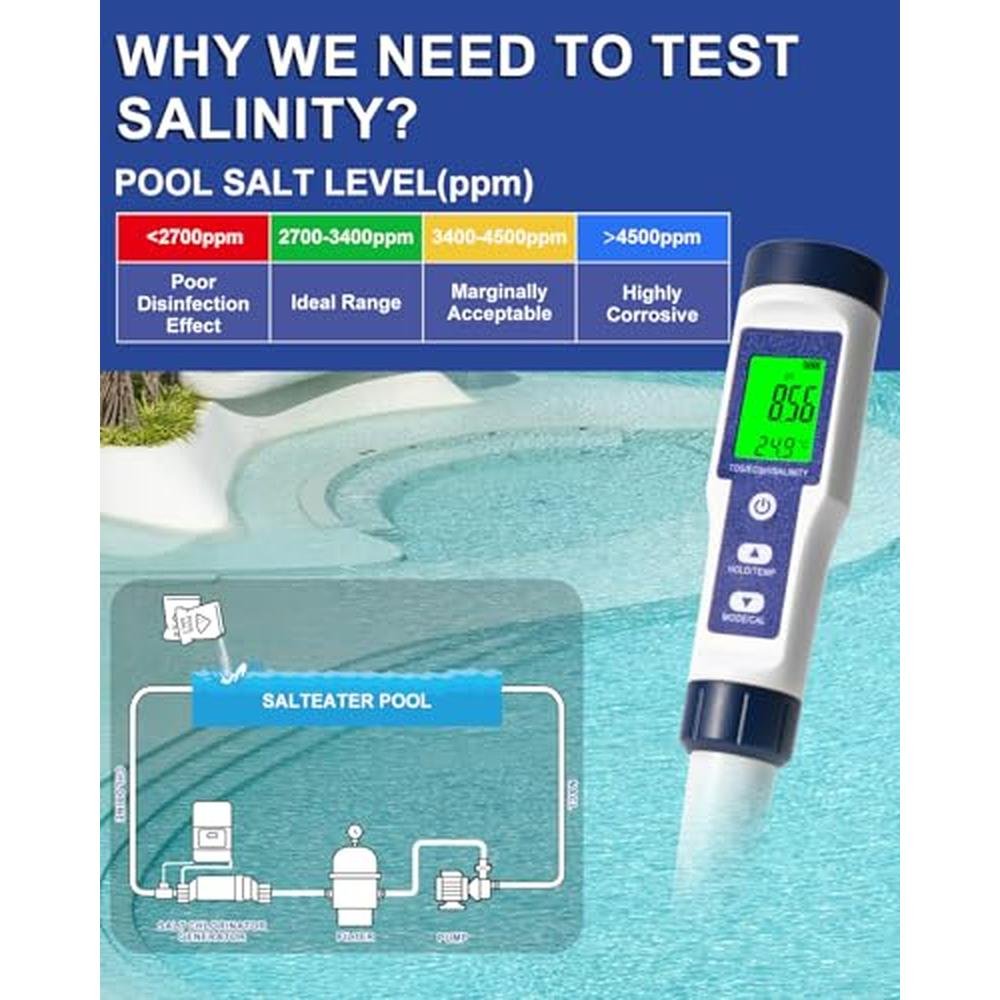 - 5-in-1 Pool Salt TesterThis digital pool water tester can get fast, digital readings of the five key water parameters-salinity, pH, electrical conductivity (EC), total dissolved solids (TDS), and temperatureall in one test. This versatile salt water pool testing kit ensures your water is safe and balanced, ideal for swimming pools, spas, aquariums, and more.