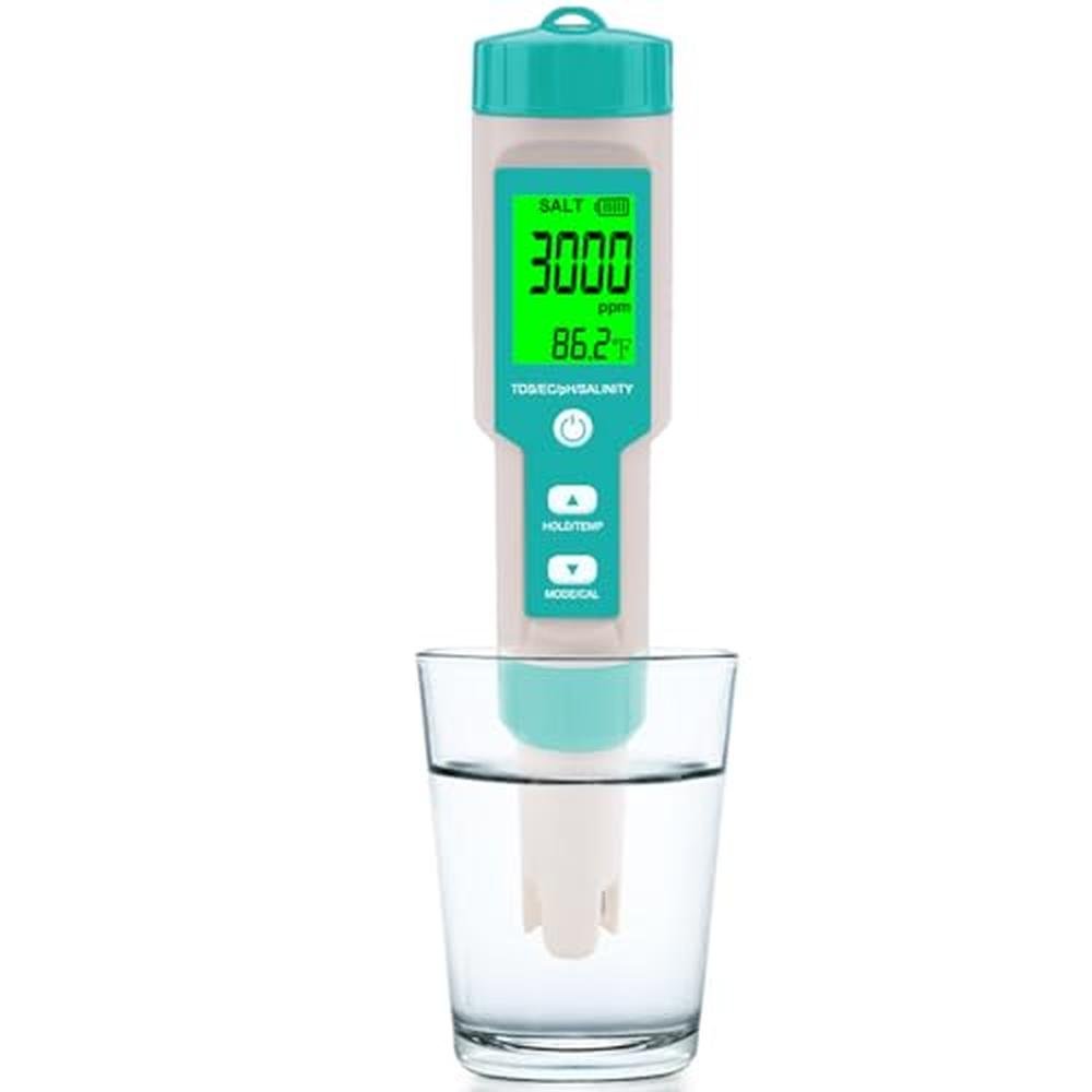 T TESTRUST 5 in 1 water quality test meter combines Salinity, TDS, EC, pH, Temperature in one meter. This not only saves your money from buying a bunch of test meter to fulfill your different needs, but also make testing easy for you with easy operation. To know whether the salinity of your pool is in safe level, you may turn on T TESTRUST Salinity meter and choose Salinity mode. Compact and portable, the T TESTRUST Pool Salt Tester is designed for convenience. Take it with you on your travels or keep it handy for regular maintenance. Trust T TESTRUST for accurate and reliable water testing, and enjoy the benefits of a clean and balanced aquatic environment. Invest in the T TESTRUST Pool Salt Tester today and make water testing a breeze! Attention 1. Dont calibrate the instrument in air. 2. If dont use it for long time, please calibrate the instrument before use. 3. After testing, clean electrode with pure water and wipe it dry.
