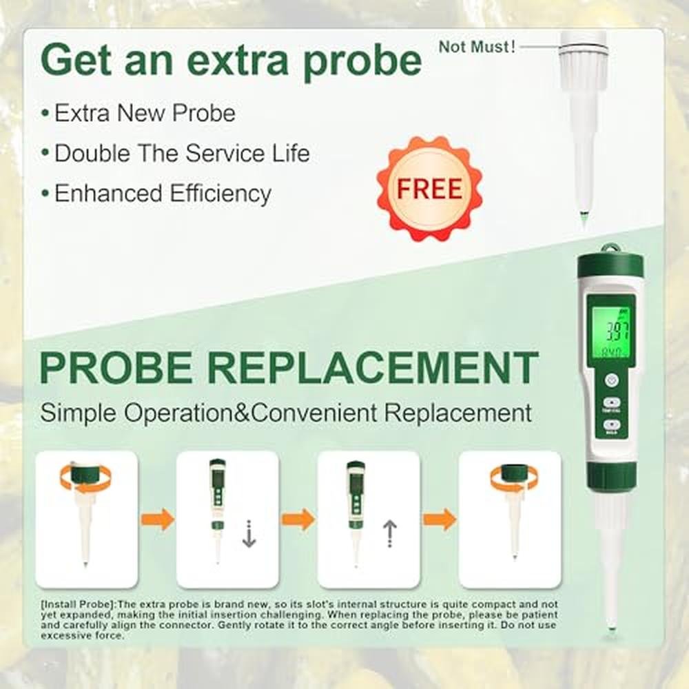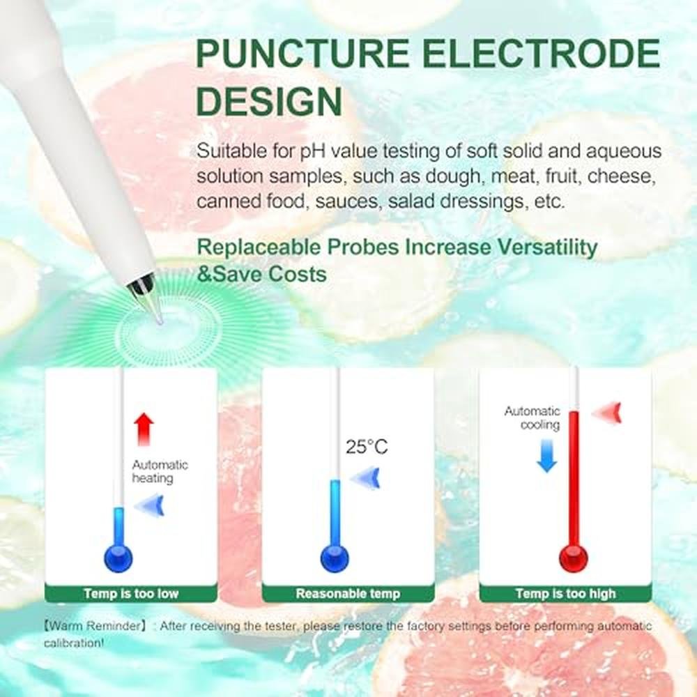 - Versatile Testing for Solids&Liquids:The RAINLEOTI pH Meter features a puncture electrode design, allowing you to test both solid and semi-solid samples (e.g., meat, cheese, fruit) as well as liquid solutions (e.g., water, salad dressing). With its 2-in-1 functionality, it is perfect for various applications such as home brewing, baking, and even soil testing for gardening projects.