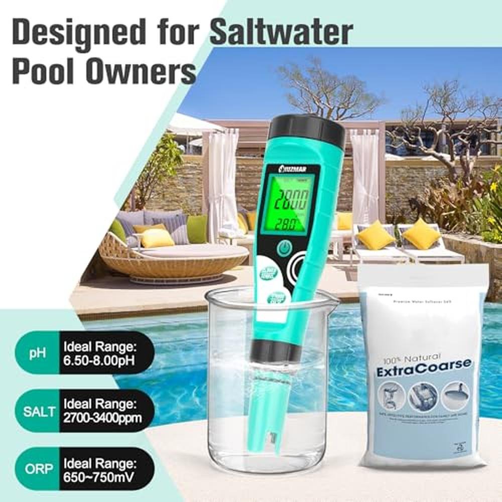 - [Saltwater Pool Tester] Effortlessly measure pH and salinity in pools, ensuring rapid and accurate determination of salt content and pH level. Maintain ideal pool pH levels and salinity within the range of 7.2-7.8 pH and 2000-3400 ppm.