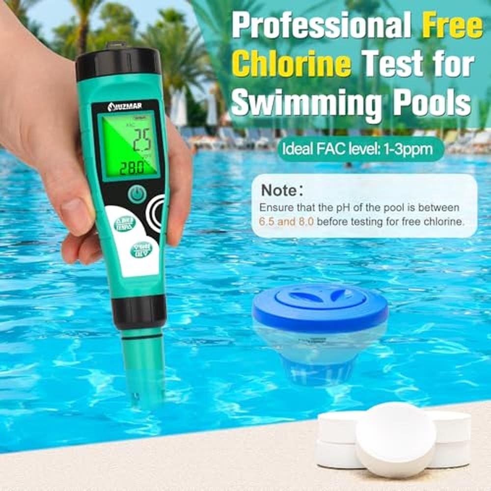 - [More Accurate Digital Free Chorine Tester] For all chlorine-based pools, it is necessary to test the Free Available Chlorine FAC of the pool water. The new UIUZMAR digital multi-parameter pool water tester with pH and ORP probe protective cap installed to keep the Free Chlorine reading more accurate.