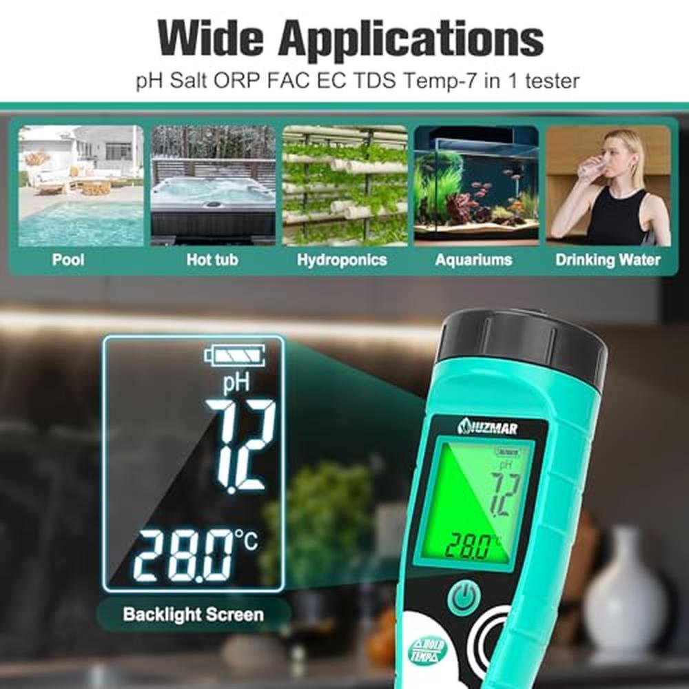 - [Multiparameter Digital Pool Water Tester] Brand new UIUZMAR swimming pool tester can be used to test the critical parameters for pool: pH, Free Chlorine, Salinity, ORP, Temperature, TDS, EC, help take more control of your pool water and hot tub.