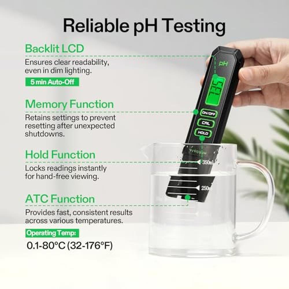 • Easy to Use: The TDS and pH testers feature backlit LCD screens for clear readability in any lighting; A hold function locks readings for easy viewing and recording, while Automatic Temperature Compensation (ATC) ensures accurate measurements across varying water temperatures; The soil tester is compact, easy to carry, and requires no batteries for operation