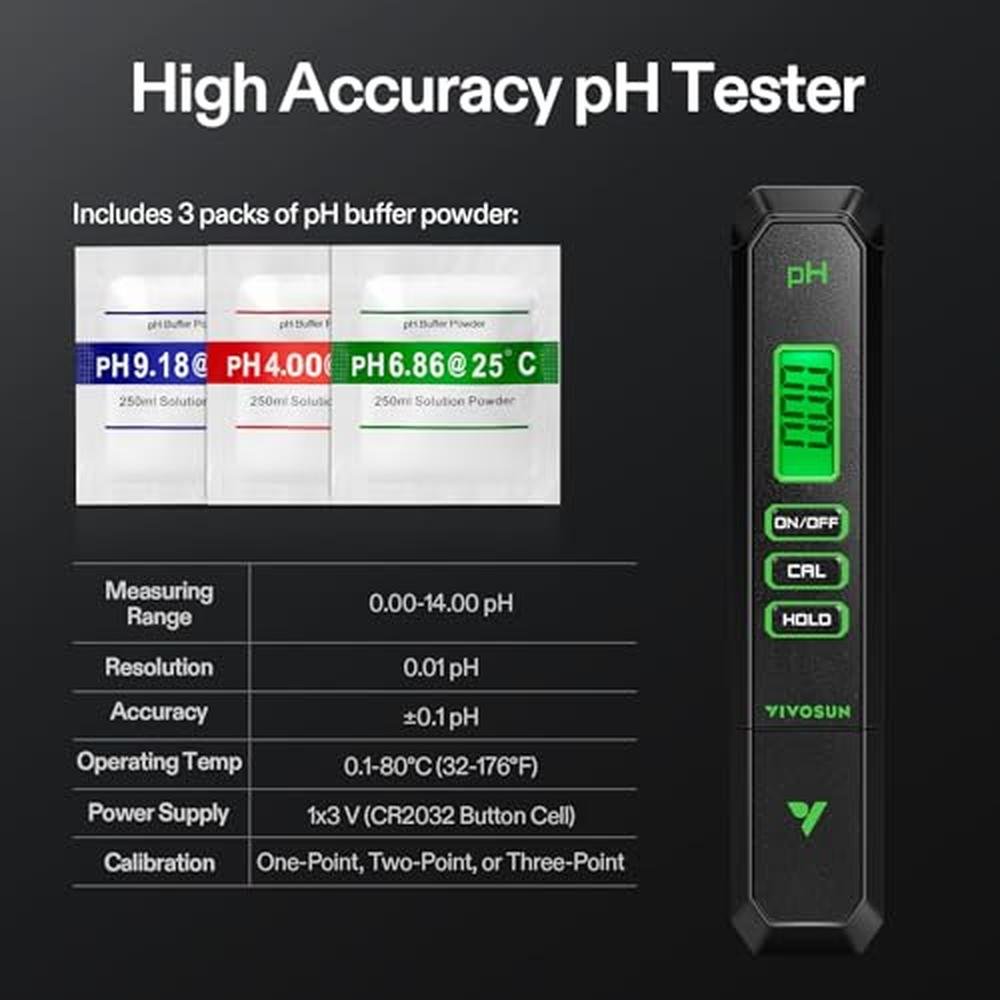 This Vivosun tool set provides everything you need to create an optimized planting environment. It includes a highly accurate pH meter and a 3-in-1 TDS meter, both featuring Automatic Temperature Compensation (ATC) for precise readings. Additionally, it comes with a premium 3-in-1 soil tester for monitoring moisture, light, and pH levels. Compact and lightweight, these tools are easy to carry and use. Ideal for homes, laboratories, aquariums, swimming pools, gardens, and hydroponic systems