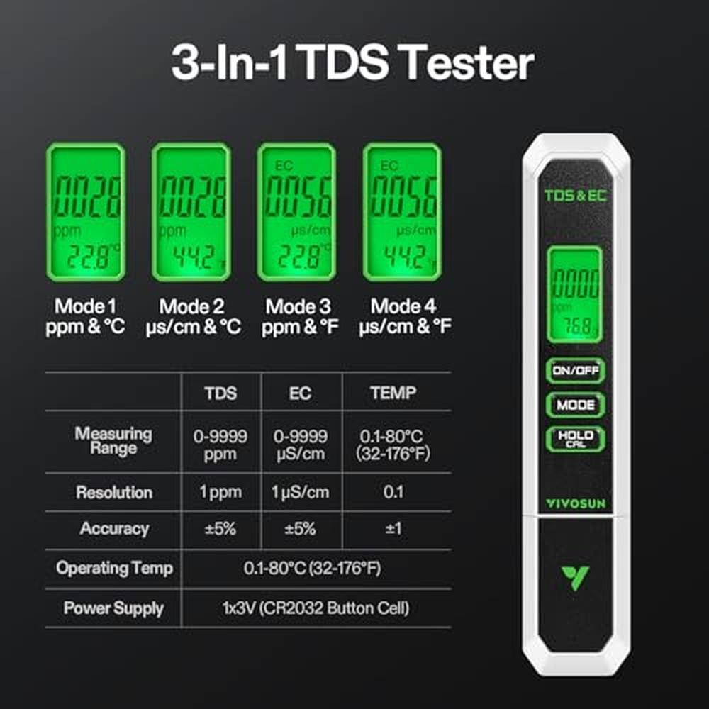 • 3-In-1 TDS Meter: Accurately measures TDS, EC, and temperature (/ switchable), meeting your diverse needs; Measuring ranges: 0-9999 ppm TDS, 0-9999 S/cm EC, 0.1-80 / 32-176 Temp