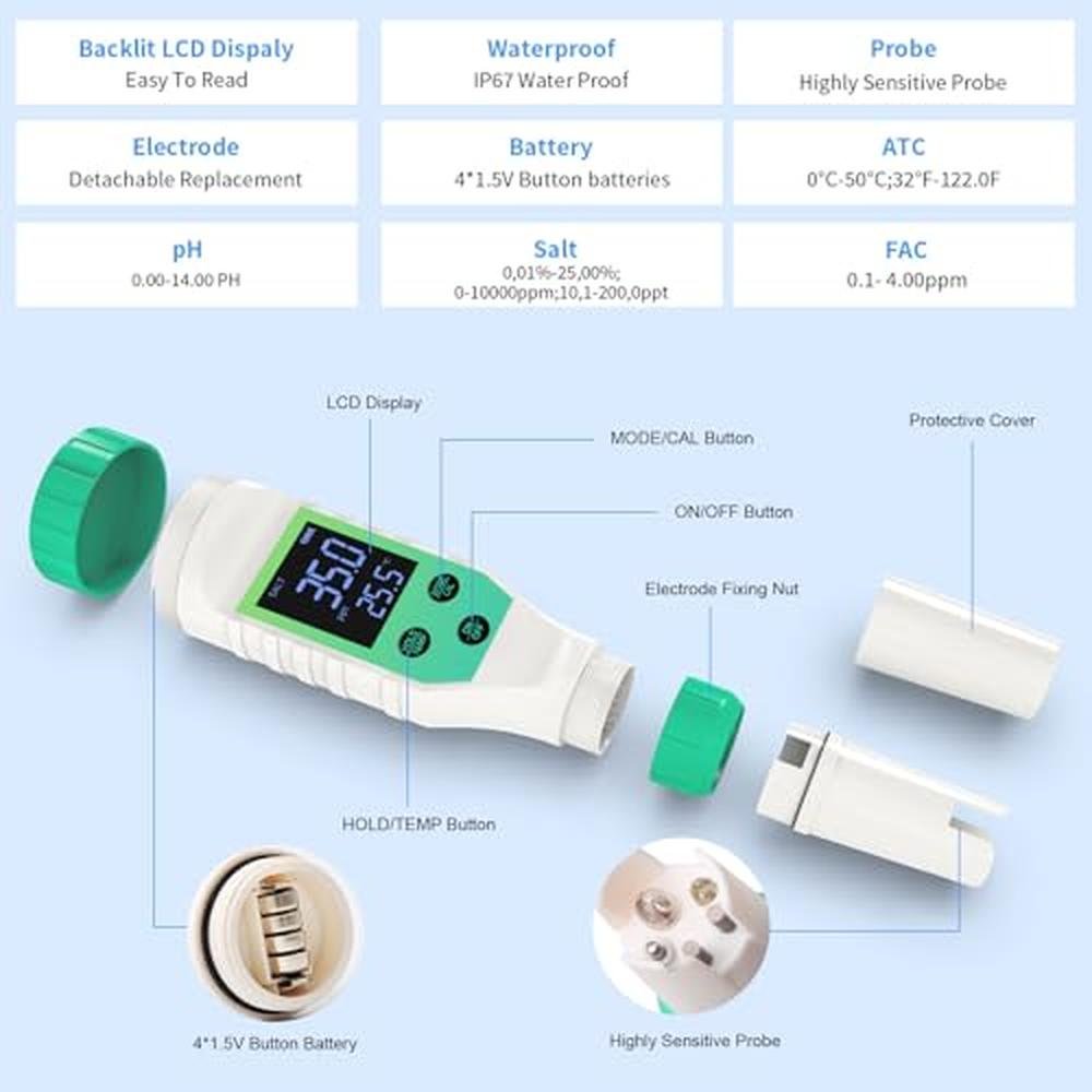 - pH Level Tester for Pool- pH: 0.00~14.00; Yewhick ph pool tester can help check the pH level of pool. Maintaining the proper pH level is critical to the operation and maintenance of saltwater pools. Typically, the ideal pH range is between 7.2 and 7.8. Regular pH testing and adjustment can help ensure clean water, comfortable swimming, and protect pool equipment from damage