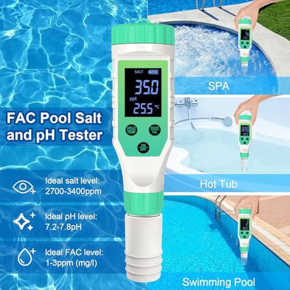 - Salt Tester for Saltwater Pool - Yewhick salinity meter can help check the salt level (Ideal level: 2700-3400 ppm) of the saltwater pool and hot tub with salt chlorinator system. Help the salt chlorinator work more efficiently in the appropriate salinity value.The Yewhick salt meter can help you keep your pool clean and avoid the negative effects of too much or too little salt on your body and pool equipment