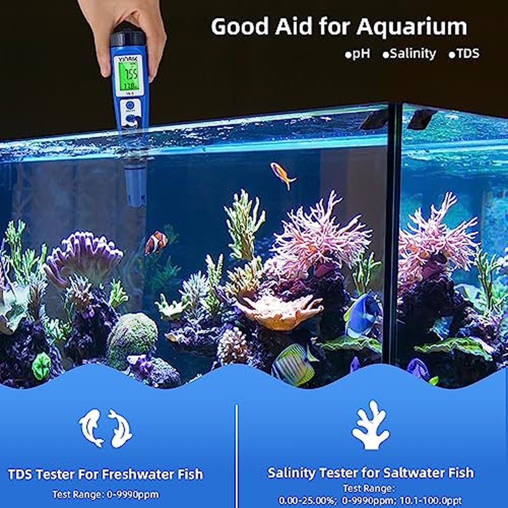 • Good Assistant for Aquarist: Water quality of the fishpond is extremely important. Slight changes in pH, temperature or salinity may lead to serious consequences. pH Meter: Keep the balance of pH value of fish tank, drastic fluctuations in pH value can seriously damage the survival environment of fish. TDS EC Salt Meter: Monitor the amount of ionic salts in the tank to remind fish keepers when to change the water to balance the ratio of various substances.