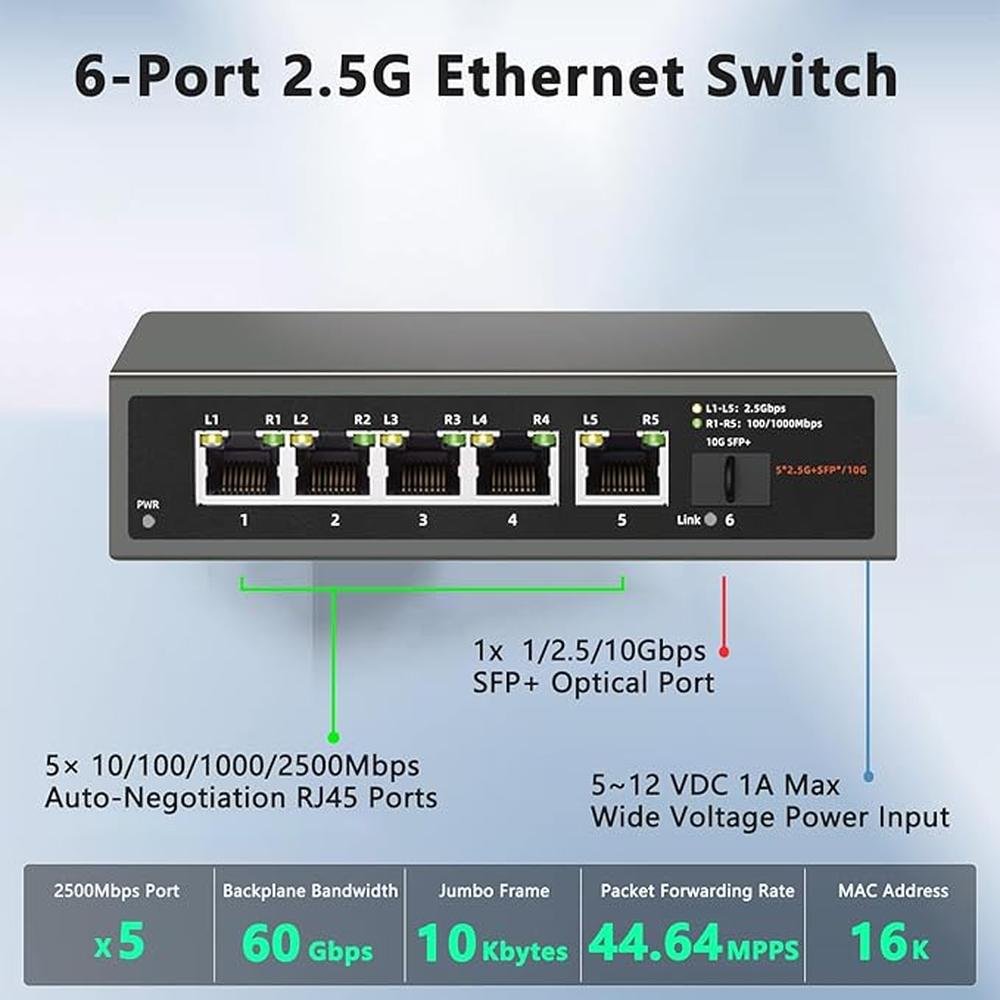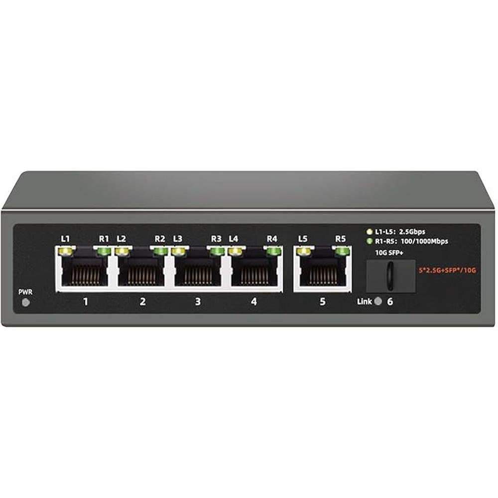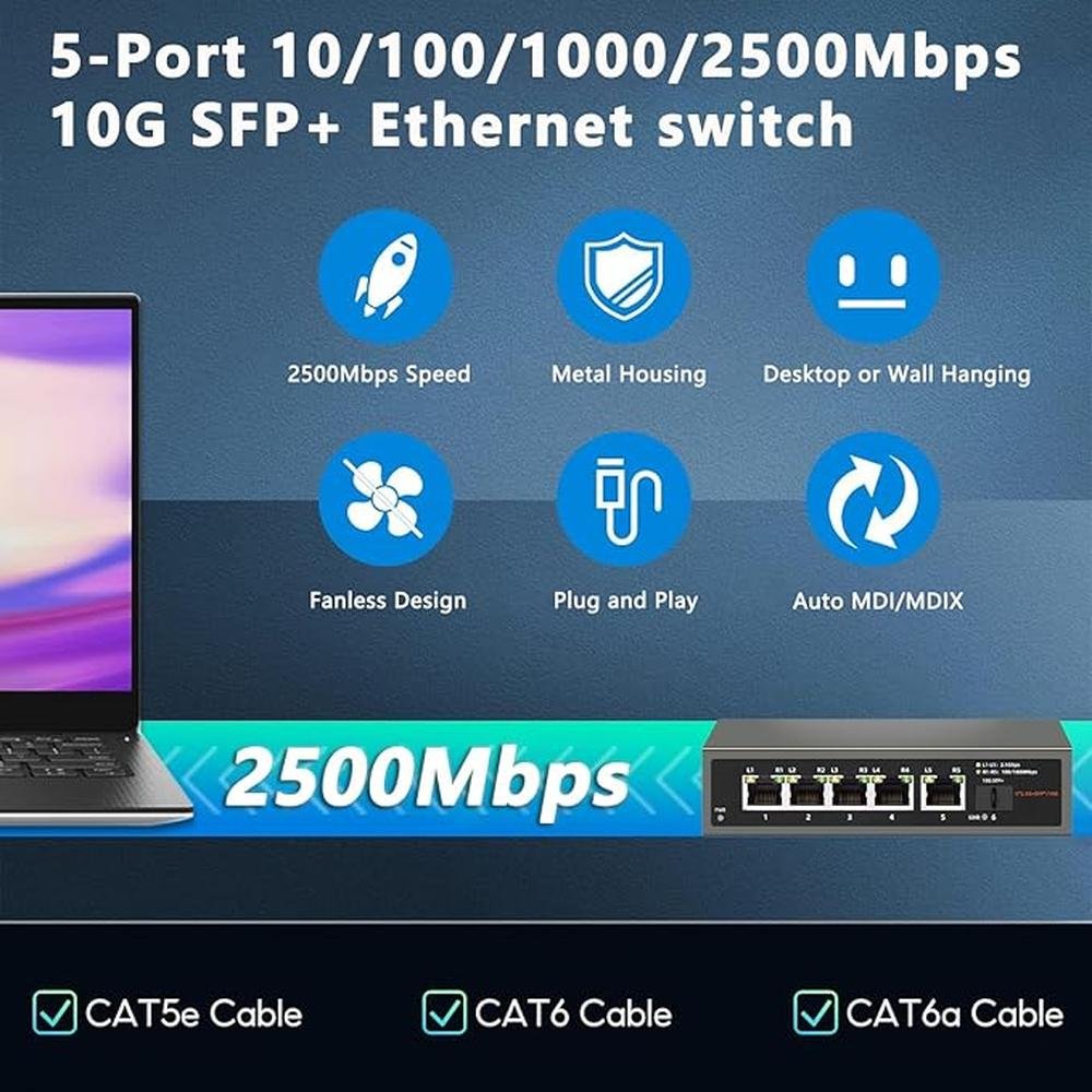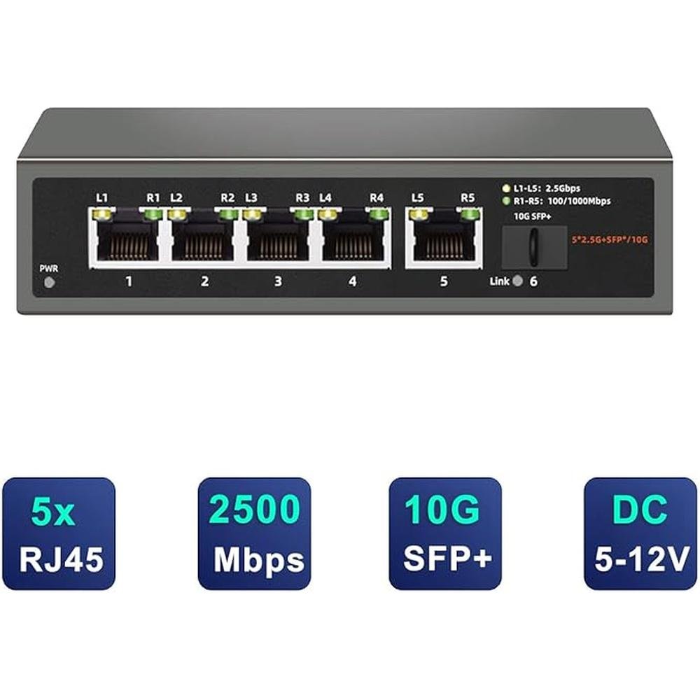 5 Port 2.5G Ethernet Switch with 10G SFP+ Uplink,1000/2500Mbps, Unmanaged 2.5Gb Network Switch, Plug & Play, Desktop/Wall-Mount, Fanless Metal Design.
