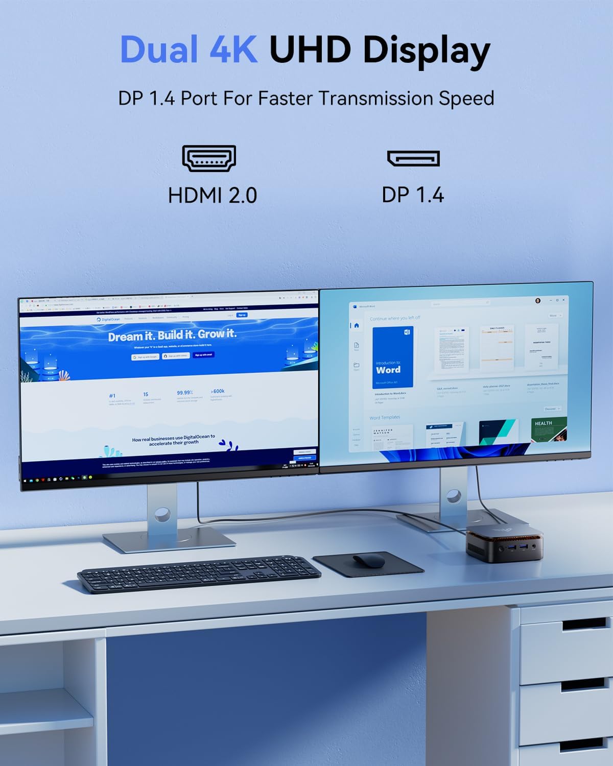 - Versatile Ports: This Desktop PC is equipped with Gigabit Ethernet for lightning-fast wired connections. Additional peripheral support is provided through USB3.2 ×2, USB2.0 ×2, HDMI 2.0 ×1, DP1.4 ×1, and a 3.5mm Audio Jack ×1, making it compatible with servers, surveillance devices, and more