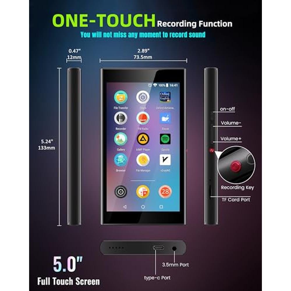 Experience the ultimate MP3 player for kids and adults alike, featuring a 5-inch touch screen and running on the latest Android 14 operating system. This versatile music player with Bluetooth and WiFi connectivity allows for seamless music streaming from popular platforms like Spotify, Pandora, and Amazon Music. With access to the Google Play Store, you can download your favorite music apps, including Libby and Audible, for an unparalleled listening experience. The device comes with 128GB of internal storage, which can be expanded up to 512GB, making it an ideal music player for kids who love music, audiobooks, and videos. Whether you're looking for a premium music player with advanced features, this device has it all. It comes pre-installed with the Google Play Store, allowing you to freely download and update your favorite apps. It also has popular apps like Spotify, Pandora, and YouTube pre-installed, enabling you to enjoy entertainment right after powering it on. The system has been upgraded from Android 8.0 to the latest Android 14, and it is equipped with a high-performance octa-core processor, significantly improving the app startup speed and the smoothness of multitasking. It has a one-click recording function, making it easy to capture your favorite moments. The package includes the G5 music player, wired earphones, an additional 64GB memory card, a USB cable, and a user manual, providing a worry-free after-sales service.