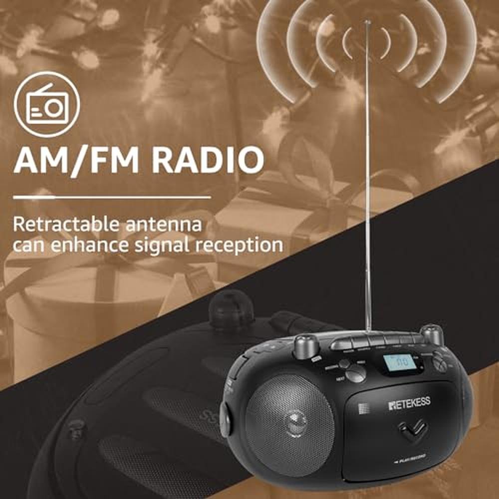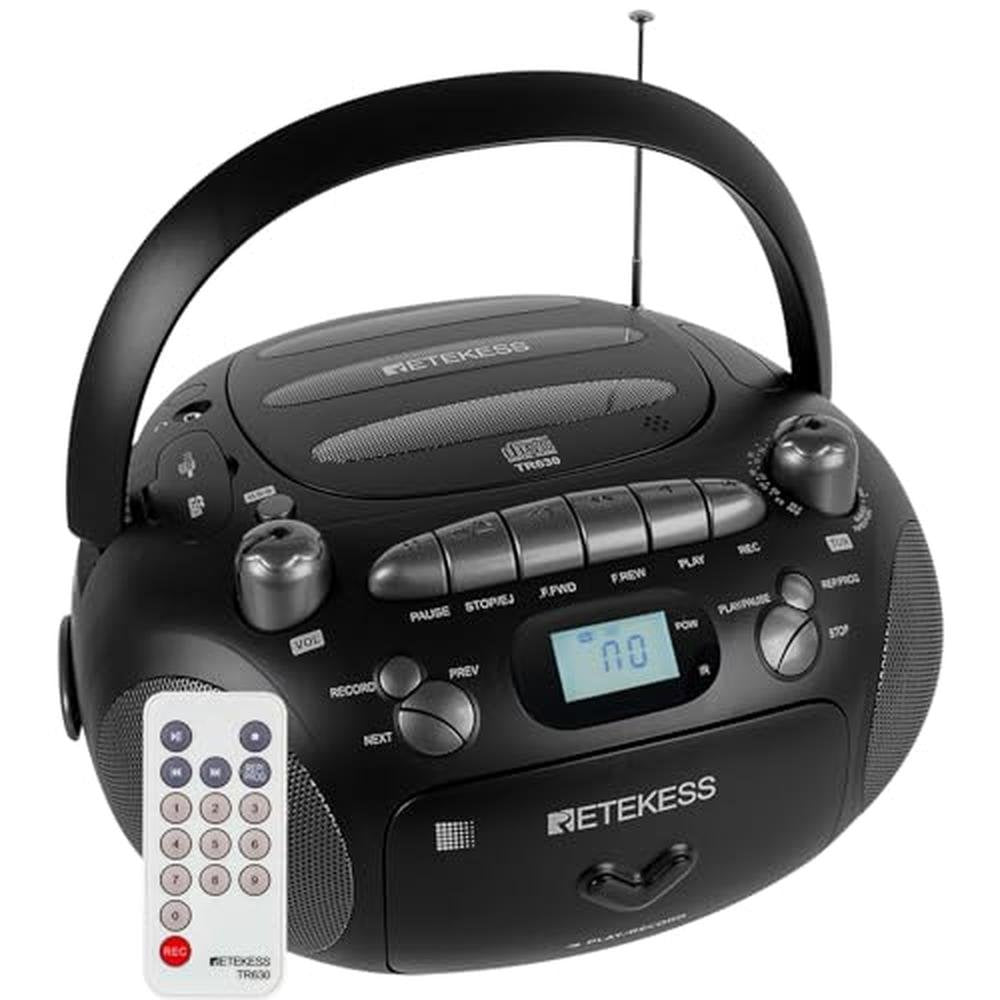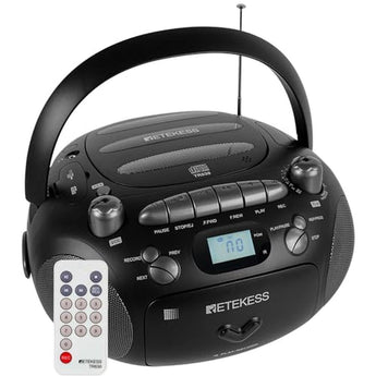 Looking for a boombox that gives you a little more? The multifunctional boombox is designed for music lovers, offering multiple playback options including CDs, tapes, USB flash drives (up to 32G), and Micro SD cards (up to 32G). This versatile CD player features a built-in voice transcription capability, allowing you to record audio from tapes or save music directly to USB/TF cards. The BBS (Bass Boost System) enhances sound quality by delivering deeper bass, making it perfect for various settings like home parties, dance studios, or camping trips where strong stereo sound is essential. Equipped with a built-in AM/FM radio, this boombox lets you enjoy diverse programsbe it music, talk shows, or sportswhile preparing breakfast or winding down at night. Its portable handle design allows easy transport to the front yard, park picnics, or any indoor space, such as bedrooms and kitchens. Power options for this CD cassette player combo include an AC cord for continuous use and 6 D batteries (not included) for long-lasting battery life during power outages. A standard 3.5mm earphone jack provides private listening, while the repeat play function ensures uninterrupted music enjoyment. Whether you're hosting a gathering or enjoying quiet moments, this boom box delivers an exceptional auditory experience, making it an ideal choice as a boom box CD player AM FM radio and a versatile radio cassette CD player. With features that combine a cassette and CD player, this CD and cassette player combo is perfect for anyone looking for a portable CD player. Whether you need a cassette CD player or a CD cassette player, this device covers all your audio needs! Package Includes: Retekess TR630 multifunctional CD radio x1 AC power cord x1 Remote control x1 User manual x1