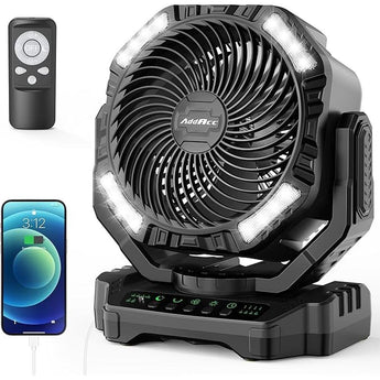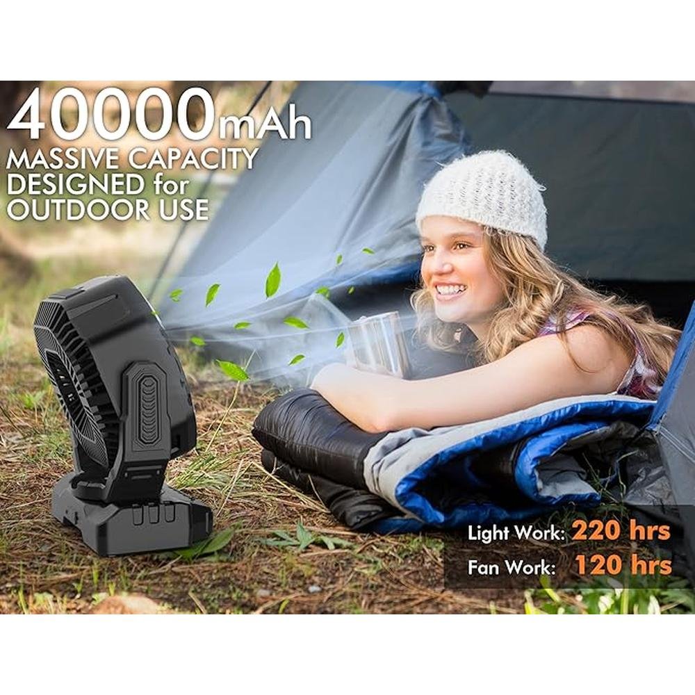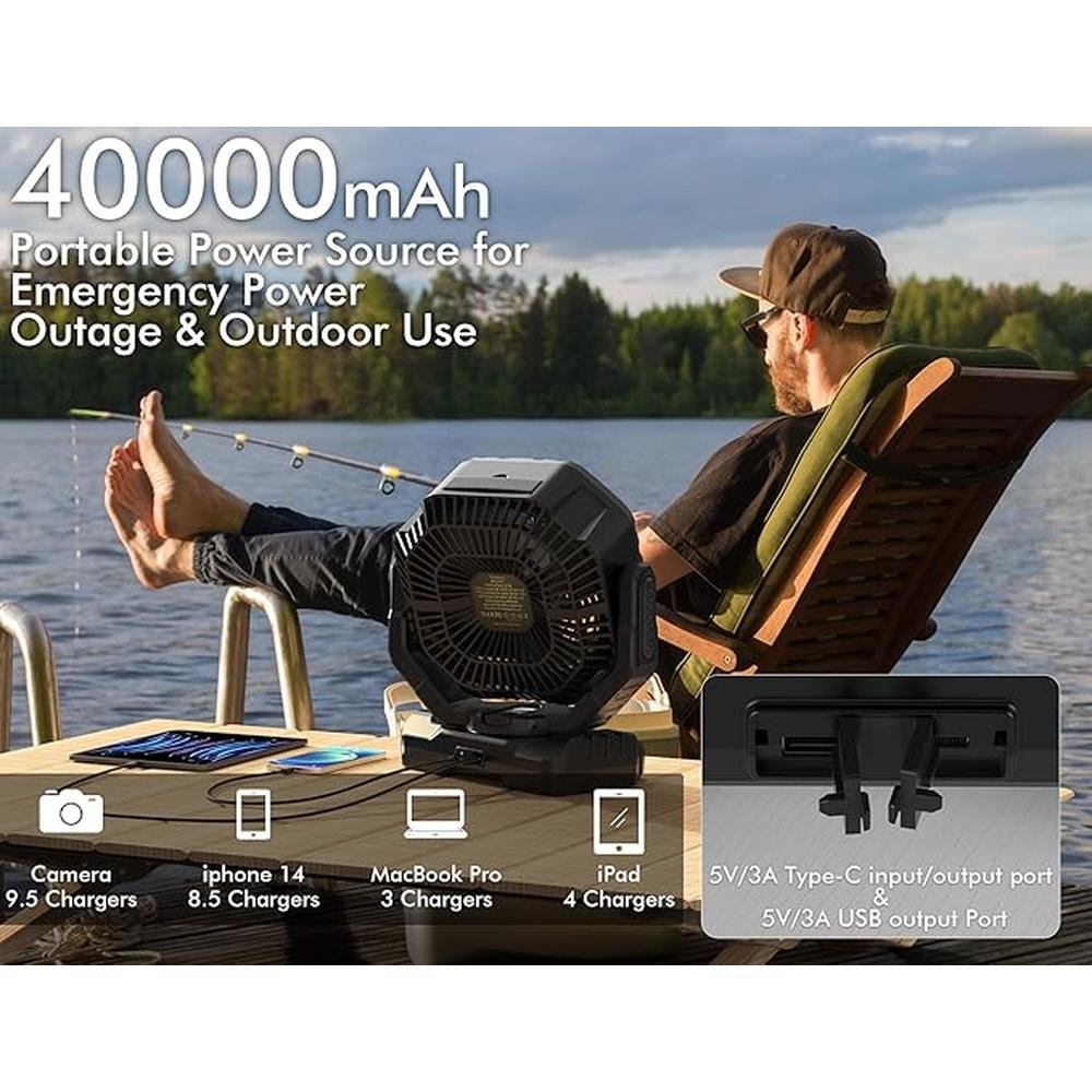 - 40000mAh Mighty Battery This Portable fan built in 40000mAh rechargeable battery, it can be work 15-220 hrs when fully charged (9-10hrs), the battery indicator help you keep track of remaining power. Equipped with 5V3A type-C inputoutput port and a USB-A output port (on the back of the fan base), can be power for other electronic devices. Its a lifesaver in emergencies like Hurricanes, Storms, heatwaves, power outages, and also perfect for camping, outside, travel, work, construction etc