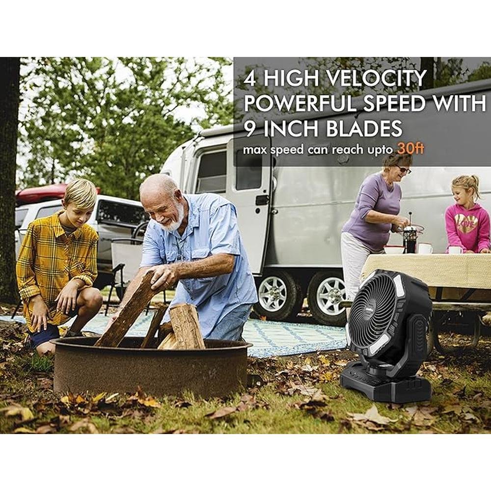- 4 High Velocity Speed and 5 Brightness Lights Equipped with 9 inch Blade and 32 LED beads of this camping fan, make it with high brightness and powerful wind speed (25-50dB), and it can be use for variety of scenarios, illuminates your surroundings and keep you cooling in dark and hot places, great for garage job-site camping tent, bedroom, home, office, RV. The highest speed can reach up-to 4.9ms, you can still feel the airflow even up to 30ft away