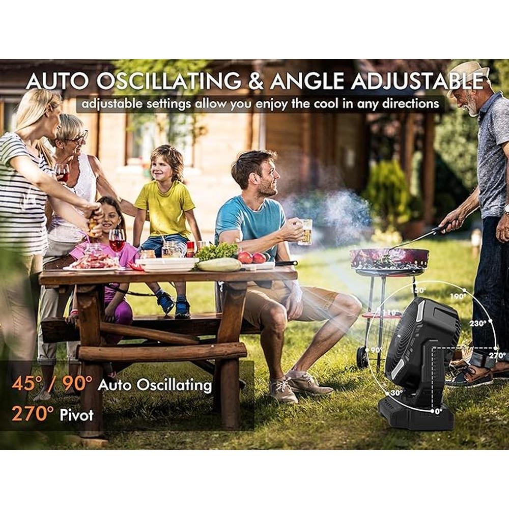 - 270 Pivot and Auto Oscillating This battery powered fan can auto oscillated from 45 to 90 in horizontally and 270 adjustable in vertical, so the angle of this fan is easily to manipulate in any direction, it can cover more area and allowing you and your family to enjoy a comfortable breeze in hot day. With a hidden silicone handle design makes the 7.56 lbs outdoor fan easy to carry. You can also open the front cover of this fan with a screwdriver (not included) to clean the blades