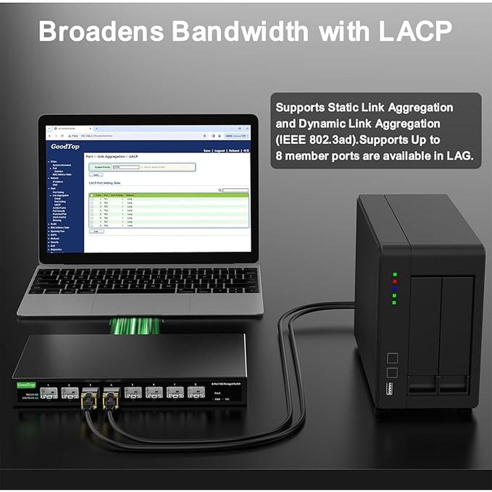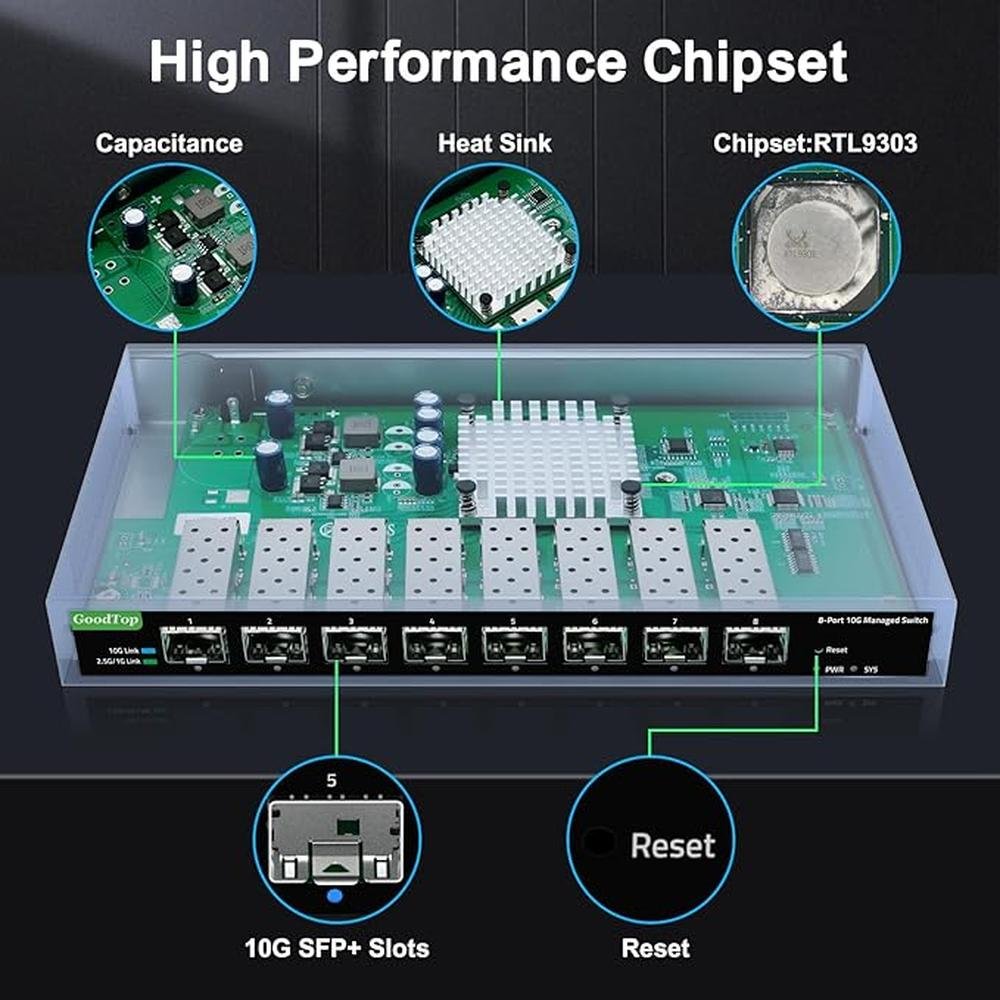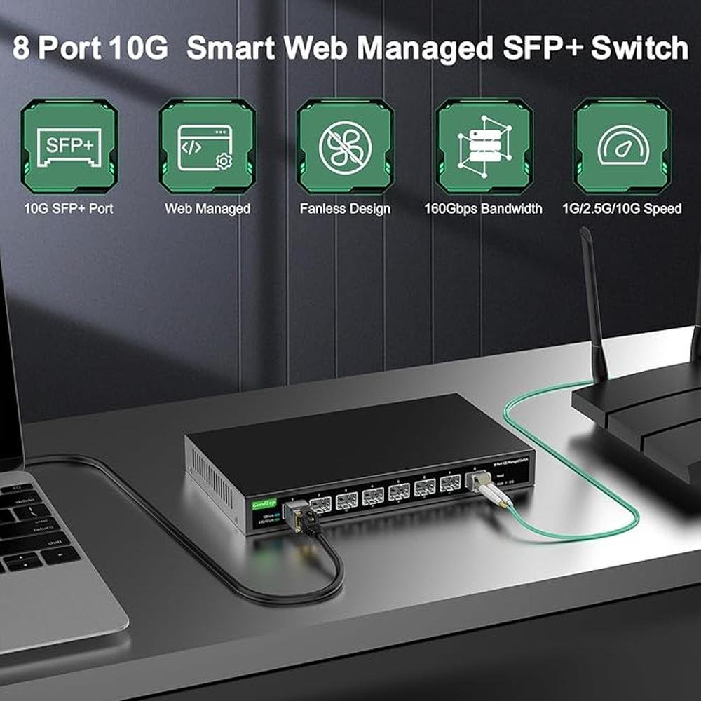 8 Port 10Gb Smart Web Managed SFP+ Switch,10G Optical Easy Managed SFP+ Ethernet Switch,Metal Fanless Home Lab Network Switch with Link Aggregation/QoS/VLAN/DHCP Client, Black, GT-SWTXG8FM