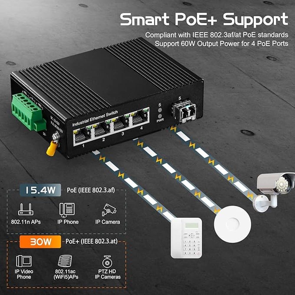 Binardat 5 Port Gigabit PoE Din Rail Industrial Ethernet Switch, 4 PoE IEEE802.3af/at, 1 SFP Port with 20km LC Module, with One 60W PoE Power Supply