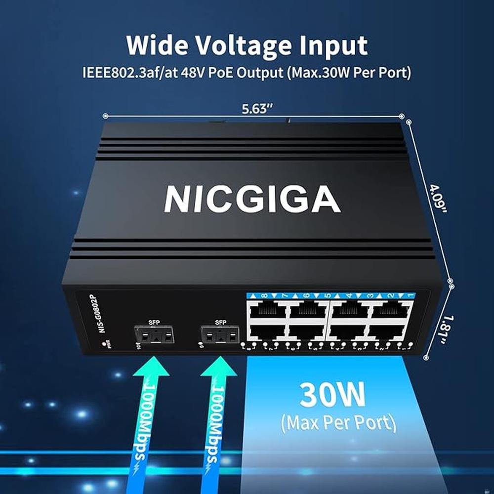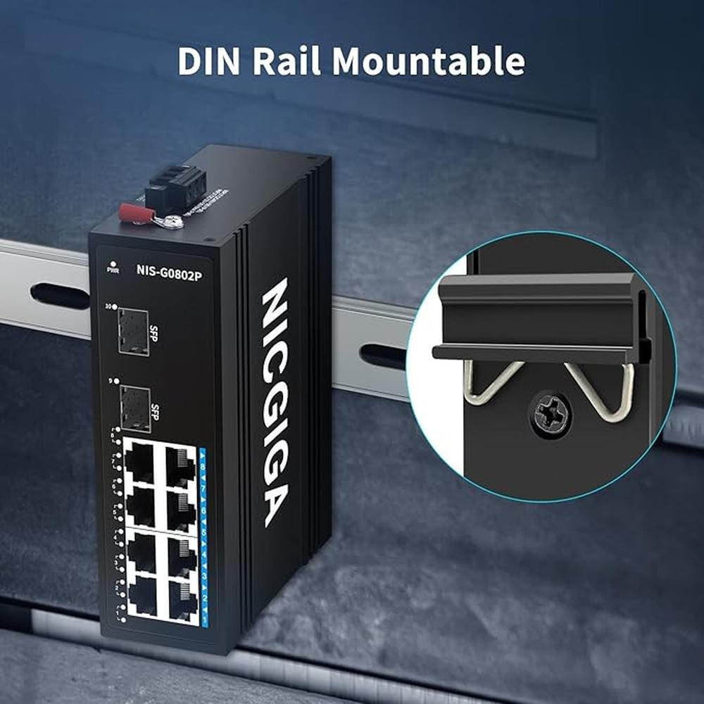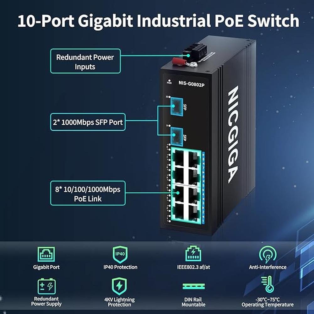 - Our Nicgiga 8-Port Industrial Gigabit PoE Ethernet Switch boasts advanced networking capabilities with high-performance Gigabit Ethernet ports, providing fast and reliable data transfer rates and an immersive networking experience that's perfect for Indian buyers who demand the best.