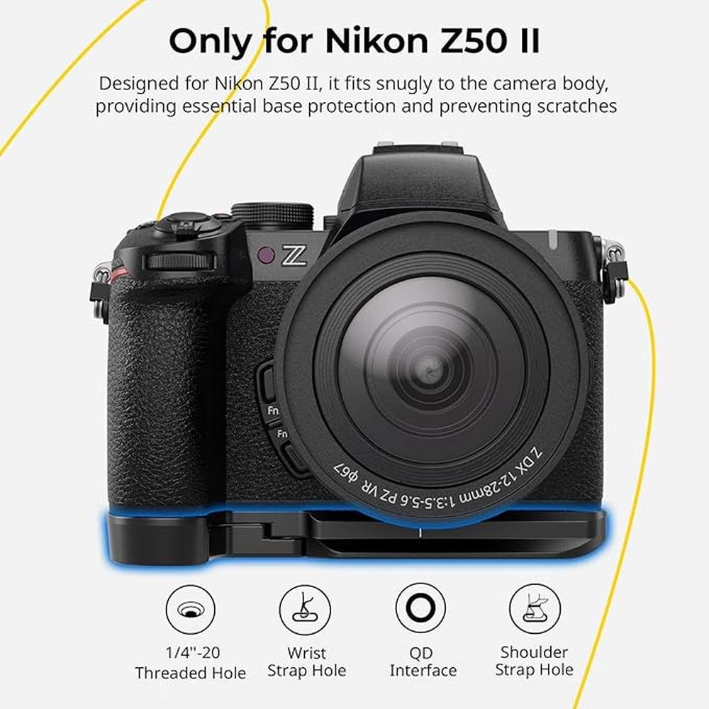 - For Nikon Z50 II This bottom mount plate is designed specifically for the Nikon Z50 II, fitting snugly to the camera body to provide essential protection for the base while preventing scratches