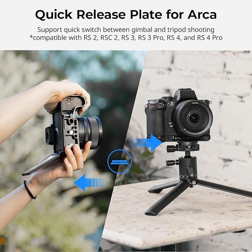 - Quick-Release Plate for Arca It features an integrated for arca-swiss quick-release plate for fast transitions between tripods for Arca-type, handheld setups, and stabilizers for DJI RS2, RSC 2, RS3, RS3 Pro, RS4, and RS4 Pro, making scene changes effortless