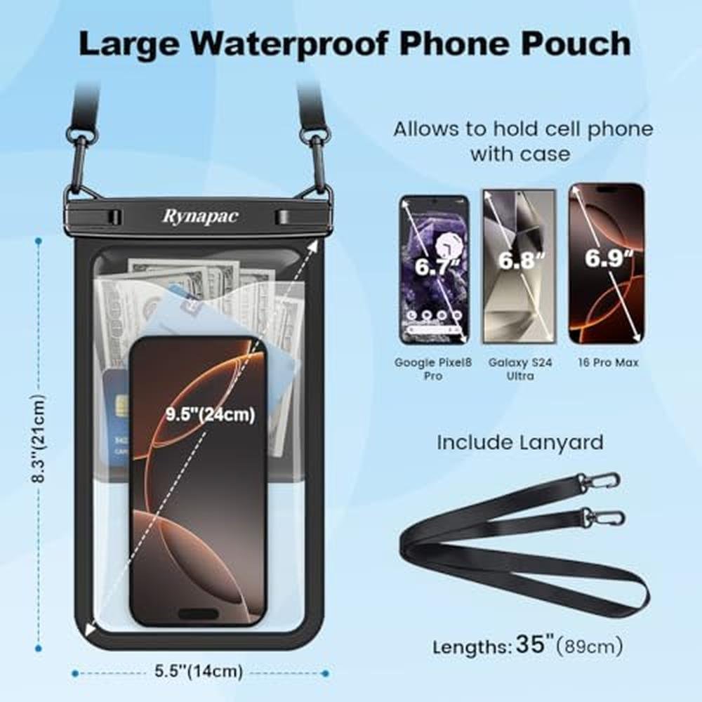 - IPX8 Waterproof Certified- Rynapac's three-layer lock-down technology ensures certified IPX8 waterproofing, delivering comprehensive protection for your 10 inch large waterproof phone pouch against water, snow, dust, and sand. Keep valuables such as passports, bank cards, cruise cards, cash, ID cards and your cell phone in a waterproof cell phone pouch at the same time to keep them completely dry. Easy to use/carry