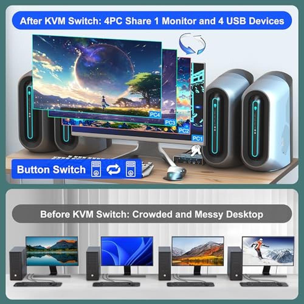 Simplify Your Setup & Boost ProductivityTired of desk clutter and constant cable switching? Our 4-Port HDMI KVM Switch offers an elegant solution, allowing you to control up to four computers with a single monitor and one set of USB peripherals. Effortlessly manage your workflow, gaming, or multimedia tasks from a centralized command centersaving space, reducing costs, and enhancing efficiency.Key Features4-In-1 Simplified ControlEfficiently connect and control up to four computers using just one monitor and up to four USB 3.0 peripheralsincluding keyboards, mice, external hard drives, flash drives, and printers. Seamlessly toggle between systems using either the convenient remote control or front-panel buttons. No complicated software or setup required.Note: Each computer and monitor must have an HDMI port to function correctly.Stunning 8K@60Hz Ultra HD ResolutionEnjoy breathtaking visual performance with support for resolutions up to 8K@60Hz and 4K@120Hz. Perfect for gaming, graphic design, video editing, and high-definition entertainment. Backward compatible with 4K@60Hz, 4K@30Hz, 25601440@120Hz, and 19201080@240Hz.Note: Both your graphics card and monitor must support 8K@60Hz or 4K@120Hz. For optimal performance, use a high-quality HDMI 2.1 cable.4-Port USB 3.0 Hub with USB-CTransfer files rapidly with three USB-A ports and one USB-C port, supporting speeds up to 5 Gbps10x faster than USB 2.0. Fully backward compatible with older USB devices. Easily share printers, flash drives, hard drives, and more across all connected computers.Note: Each computer must be connected to the KVM via a USB-A cable for keyboard/mouse recognition.Two Convenient Switching MethodsUse the tactile button on the device or the included wired desktop controller for smooth and instant source switching. LED indicators clearly display the active computer. Tuck the main unit away for a clean, organized desk setup.Hotkey switching is not supported.Wide Compatibility, Truly Plug & PlayWorks seamlessly across Windows, macOS, and Linux systemsno drivers needed. Compatible with PCs, laptops, MacBook Pro, Mac mini, Nintendo Switch, PS5, PS4, PS3, Xbox One, and more. Ideal for offices, studios, classrooms, gaming setups, and IT testing environments.Stable Powered PerformanceIncludes a 12V/1A external power adapter to ensure consistent and reliable operation, even with high-power USB devices. Backed by a 12-month warranty and dedicated customer support.Must be connected to the power adapter for proper operation.Whats in the Box?1x 4-Port HDMI KVM Switch1x Desktop Controller1x 12V/1A Power Adapter1x User Manual