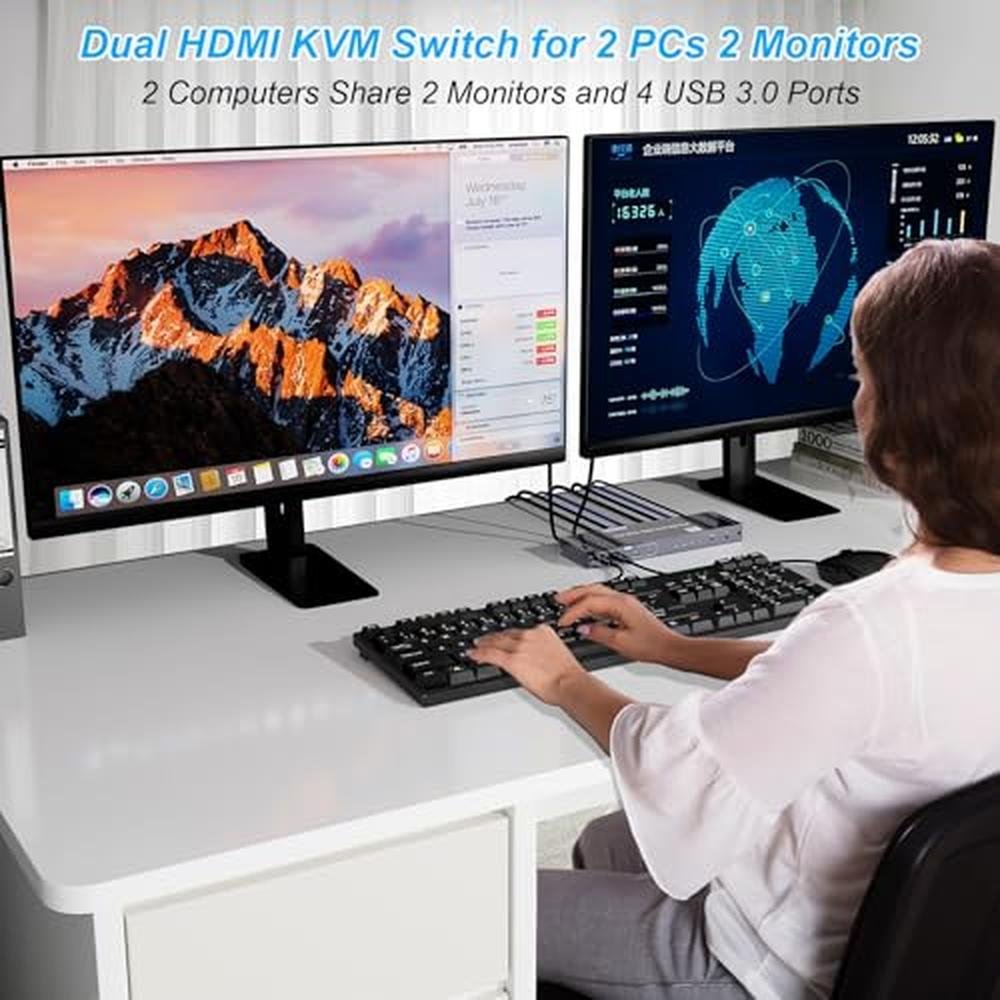 - Dual Monitor KVM Switch:This HDMI KVM switcher allows users to control 2 monitors 2 computers with a single keyboard, mouse.Perfect for users who need expansive screen which have 2 HDMI ports real estate to enhance productivity and workflow efficiency (Note:Requires 2 HDMI ports for each connected computer and make sure your PC or laptop supports multiple monitors)