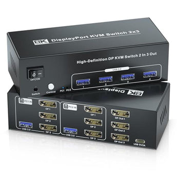 8K DisplayPort KVM Switch 3 Monitors 2 Computers 2-Port, 8K@60Hz, Dual Computer Control Effortlessly Manage Two Computers Across Three Displays Upgrade your workstation with the ultimate in display technology and convenience. This 8K DP KVM Switch 2 computers 3 monitors is designed for power users, allowing you to control two computers with one set of keyboard, mouse, and 3 monitors, delivering unexpected performance and efficiency. Three Monitors Support Easily switch between two computers while maintaining three-monitor setups, this three monitor Displayport KVM switch is ideal for multitasking environments where two displays per computer are essential. Integrated USB 3.0 Hub Share up to four USB 3.0 peripherals, including your keyboard, mouse, and external storage devices, between the two connected computers, ensuring fast data transfer speeds and seamless connectivity. 8K60Hz 4K120Hz Resolution Support This 2 port DP KVM switch supports up to 8K@60Hz 4K@120Hz resolution on all three outputs. Ideal for tasks that require high-definition displays, such as video editing, graphic design, and data analysis. Flexible Switching Methods Switch between connected computers using convenient methods such as front panel buttons or external switching control kit. Enjoy quick and easy access to the computer you need. Note: no hotkey switch.