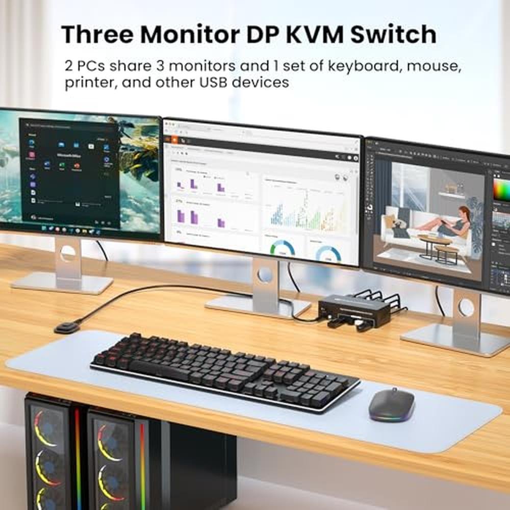 - Displayport KVM Switch 3 Monitors 2 Computers: Elevate your workspace and streamline your computing experience with our 8K 2 port DP KVM Switch, designed for 2 computers inputs(Via Displayport) and 3 DP outputs. This three monitor Displayport KVM Switch 2 port allows you to control two computers using a single set of peripherals while extending the display across 3 monitors.