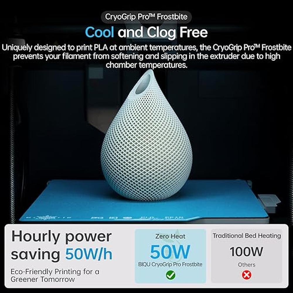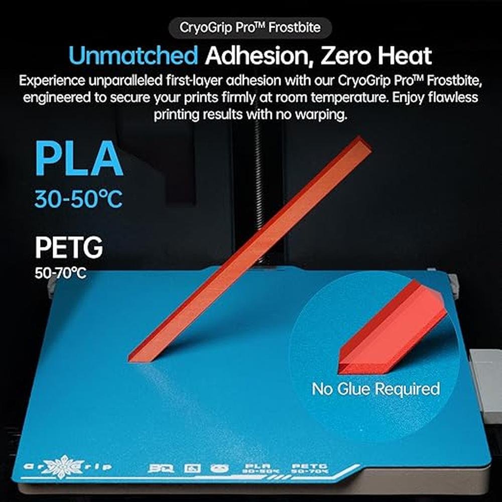 - Cool and Clog FreeUniquely designed to print PLA at ambient temperatures, the CryoGrip Pro Frostbite prevents your filament from softening and slipping in the extruder due to high chamber temperatures. With the breakthrough cold printing technology of CryoGrip Pro build plate, you can save 50Wh of power compared to traditional PEI build plate in printing that needs bed heating. Half energy can be saved