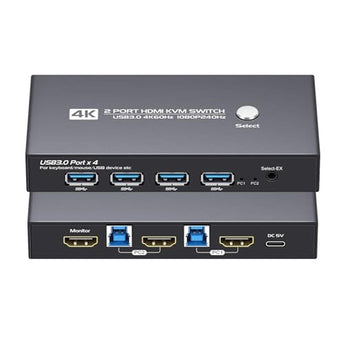 - HDMI KVM switch 1 monitor 2 computers EDID simulator: This is a 4K ultra-high-definition HDMI KVM switch that allows two computers to share a keyboard, mouse and a monitor; each channel supports one 4K HDMI signal and one USB3.0 input. There are 4 USB 3.0 peripheral interfaces, 5Gpbs/S high-speed transmission, and support more USB devices.