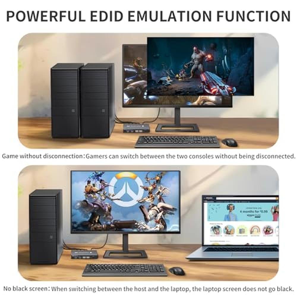 - HDMI KVM Switch 2 Port BOX,1 Monitors 2 Computers:EDID simulator function, so that your game is smooth and unchanged. It will not adjust the desktop size when you switch, and the desktop icons will not change. If one of the computers is a laptop, the laptop will not have a black screen when switching channels. Supports two switching methods, the key switch itself and the extended key switch.