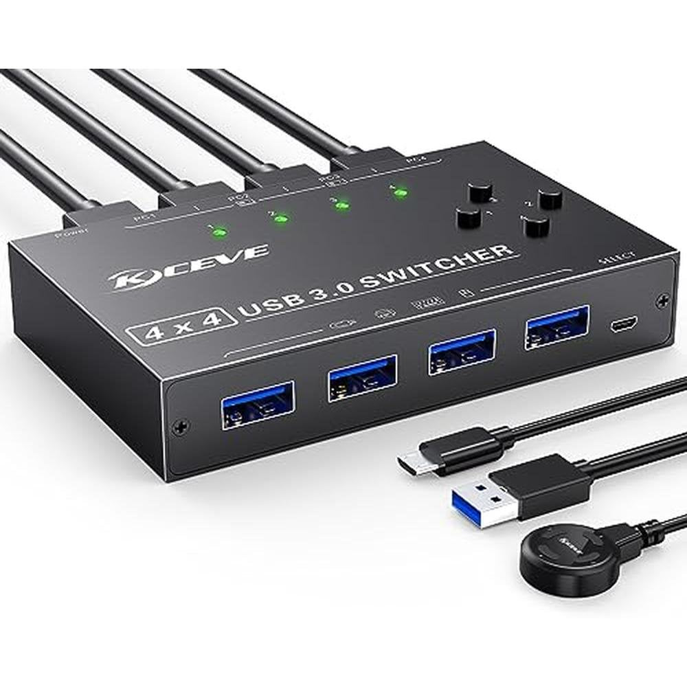 • 4 in 4 Out USB 3.0 Switch SelectorCamgeet 4 Port USB 3.0 Switcher allow using button switch or wired remote to toggle between 4 computers to share 4 USB peripheral devices without constantly pull cables or set up complicated network sharing software.