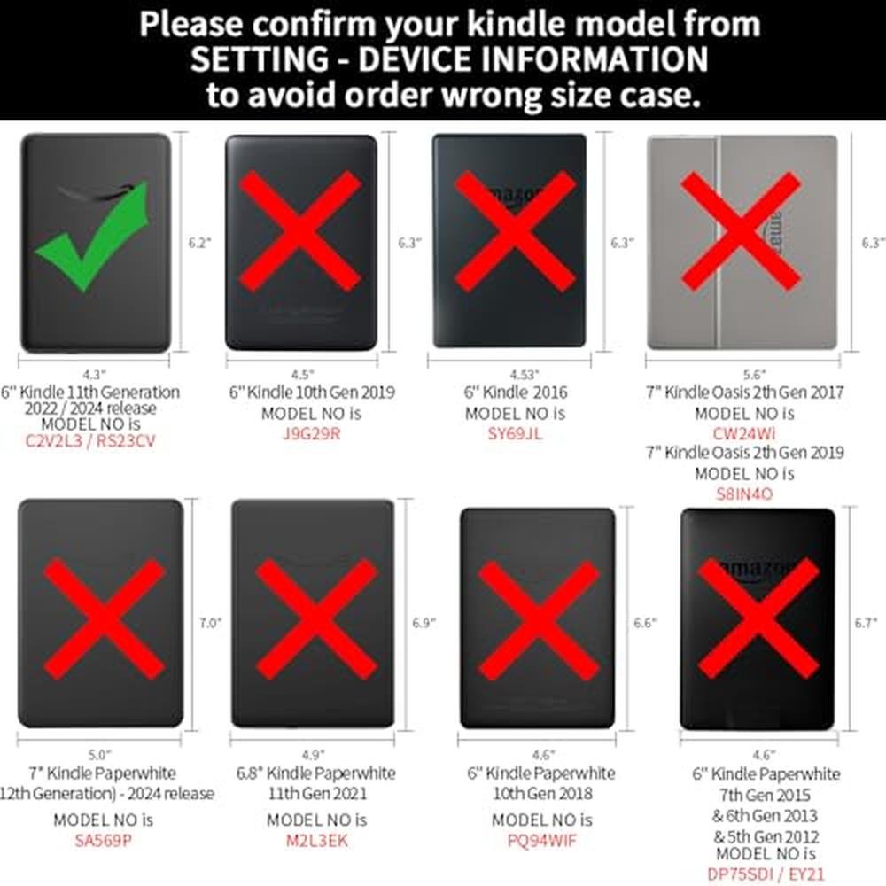 Perfect back cover case for 6 Kindle (11th Generation) - 2024 release (MODEL NO. RS23CV) and 6 Kindle (11th Generation) - 2022 release (MODEL NO. C2V2L3). Please confirm your Kindle model from SETTINGS - DEVICE INFORMATION to avoid ordering the wrong size case.