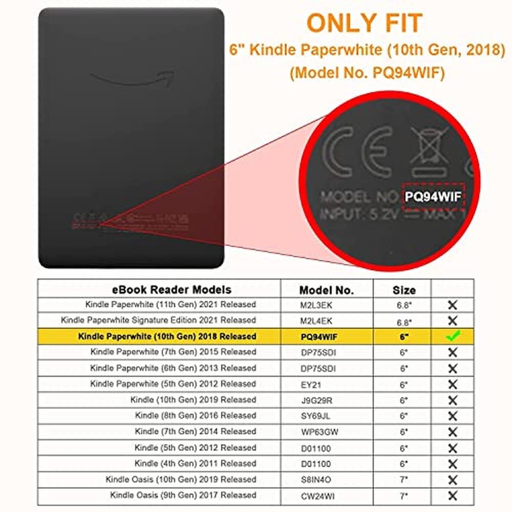 Compatibility model: Only compatible with Amazon Kindle paperwhite 6 (10th Generation, 2018 Release) (Model No.PQ94WIF) (Will Not Fit Kindle paperwhite prior to 2018, Kindle or Kindle touch). NOT fit other models. Product Features: 1. All Corner Protection: The 4 reinforced corners design effectively cushions the impact generated by accidental falling and reduces corner damage. 2. Screen and Camera Protection: Raised bezels offer maximum protection of the screen and camera. Soft, clear edges protect your tablet from scratches and bumps. 3. Anti-Yellow Original Beauty: The crystal clear back cover could show your device's classic styling color and the logo. 4. Superior Protection: This flexible TPU back case offers comprehensive coverage to protect your tablet against daily wear and tear, scratches, marks, and sudden falls. 5. Precise Cut-outs: The case sports precise cutouts to provide full access to all ports, buttons. 6. Easy Installation: A snug fit design makes it easy to install and remove, adding a layer of convenience for whenever you wish to alternate between cases. 7. Slim-fit and Lightweight: Ultra thin and lightweight crystal clear Transparent shell skin cover, transparent shell adds minimal bulk. 8. Ideal Gift: Fashion and a good gift for your family and friends, business, school, girls, boy, women, men, child, kids, etc. Package Includes: 1. A Case UUcovers Kindle Paperwhite 6 (10th Generation, 2018 Release) (Model No.PQ94WIF) Protective Case 2. Gift A Stylus Pen and Cleaning Cloth