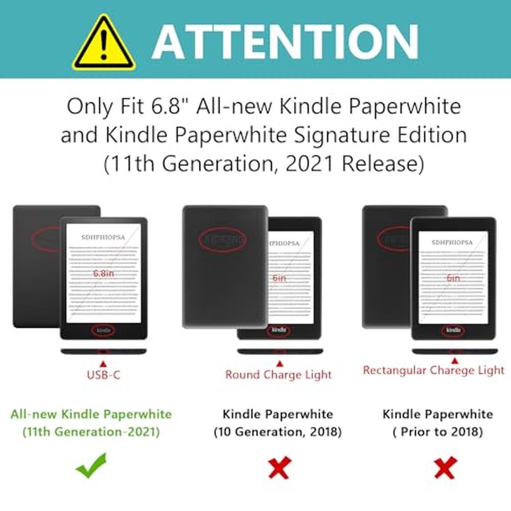 Designed specifically for the 6.8 Amazon All-New Kindle Paperwhite and Kindle Paperwhite Signature Edition E-Reader (11th Generation - 2021 Release), our case ensures a precise fit. Before ordering, please verify that your Kindle Paperwhite model is correct. Our premium PU leather case provides maximum protection against scratches, dirt, scuffs, water splashes, and shock damage, with a soft microfiber lining for extra protection. Precise cutouts allow easy access to all features and controls.