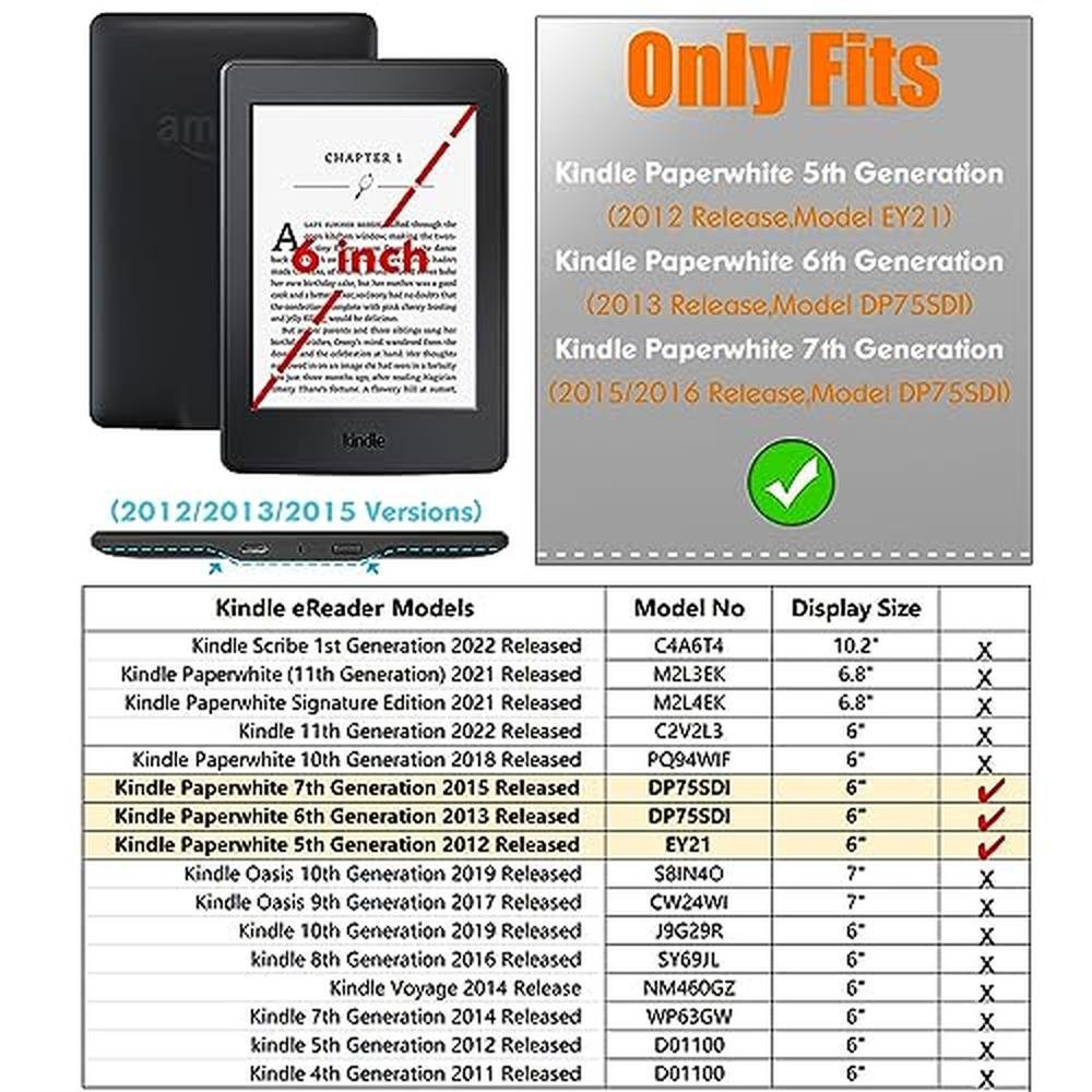 - Perfect fit for Kindle Paperwhite 5th, 6th, and 7th Generation, with precise clipping and cutouts for easy access to all buttons, jacks, and functions